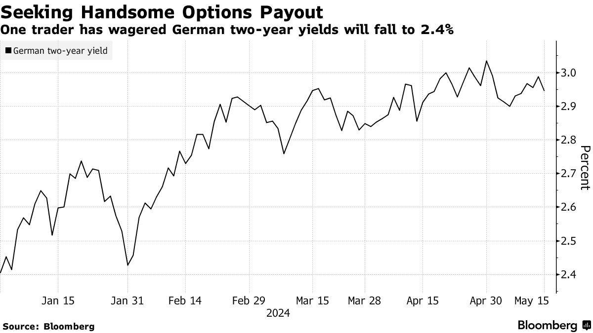 仅本周,交易员已发起多项与德国债券和基准货币市场利率相关的赌注,如果欧洲央行从下个月开始实施激进的降息政策,这些赌注将获利。本周三最新的一项将在欧洲央行每次会议都降息直至十月时支付超过600万欧元(650万美元),是押注金额的14倍多。