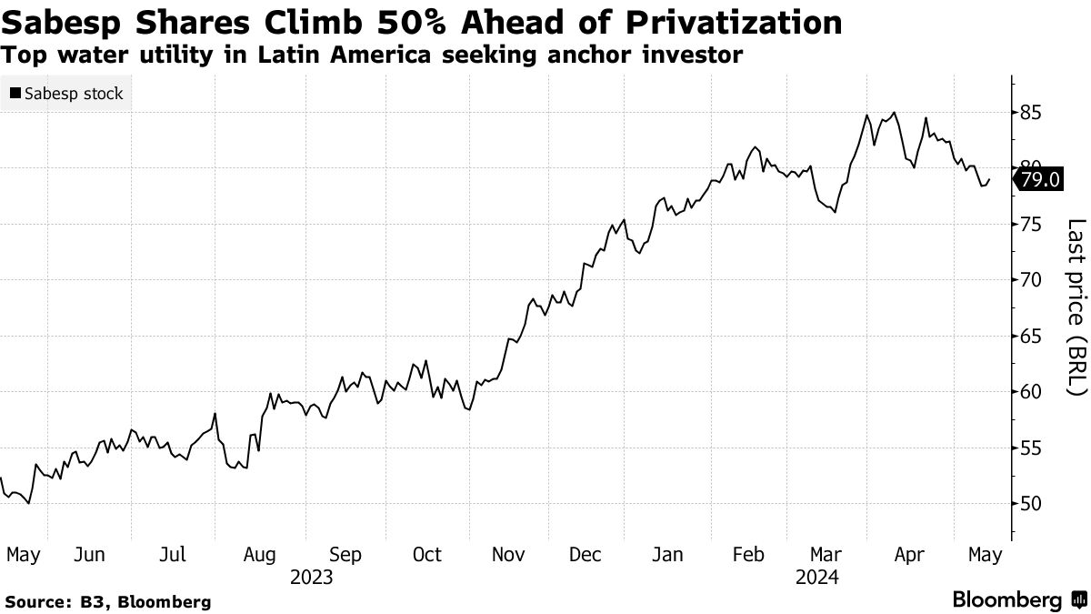 Sabesp的上涨是由私有化计划推动的。股票分析师认为其股价可能上涨到96雷亚尔,较目前水平增长22%,Itau和摩根大通预测甚至可能达到120雷亚尔。