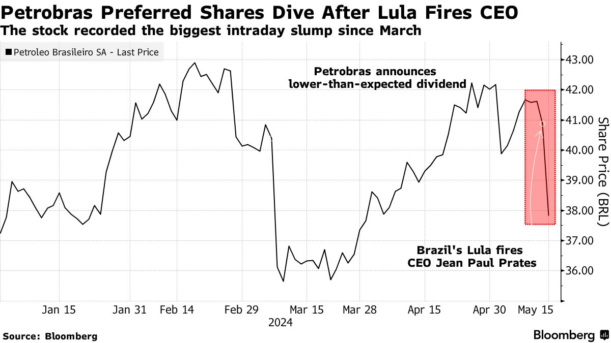 这些下跌是在政府决定在周二晚上解雇巴西石油公司首席执行官让·保罗·普拉特斯之后发生的,此前数月围绕股息支付的争议不断。普拉特斯在周三的董事会会议上正式被解雇,同时还解除了首席财务官塞尔吉奥·卡埃塔诺·莱特的职务。