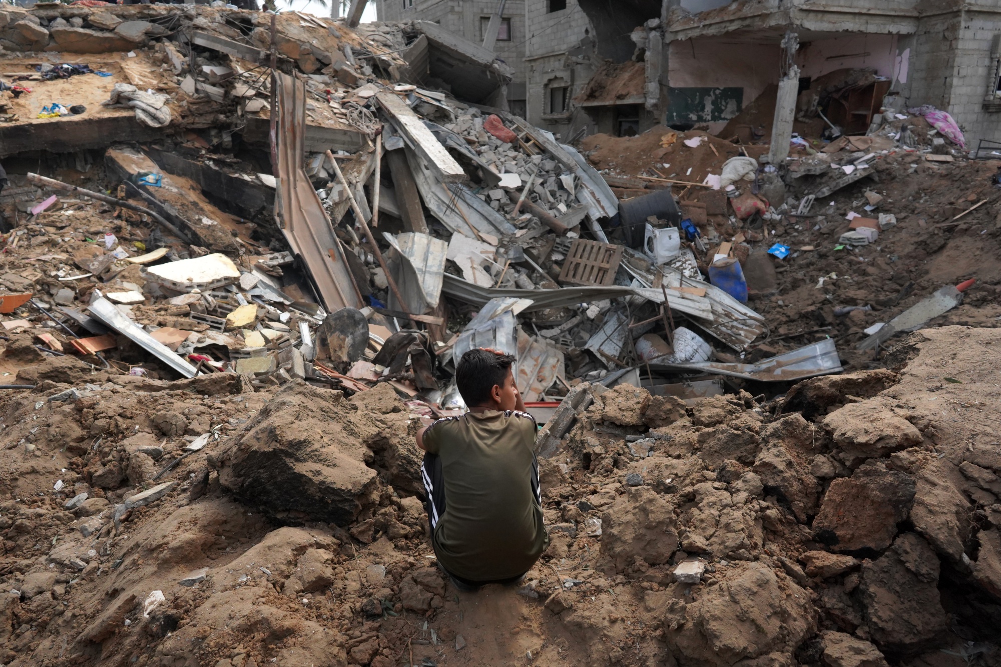 一个男孩坐在5月11日在阿尔扎维达被摧毁的住宅建筑的废墟旁。