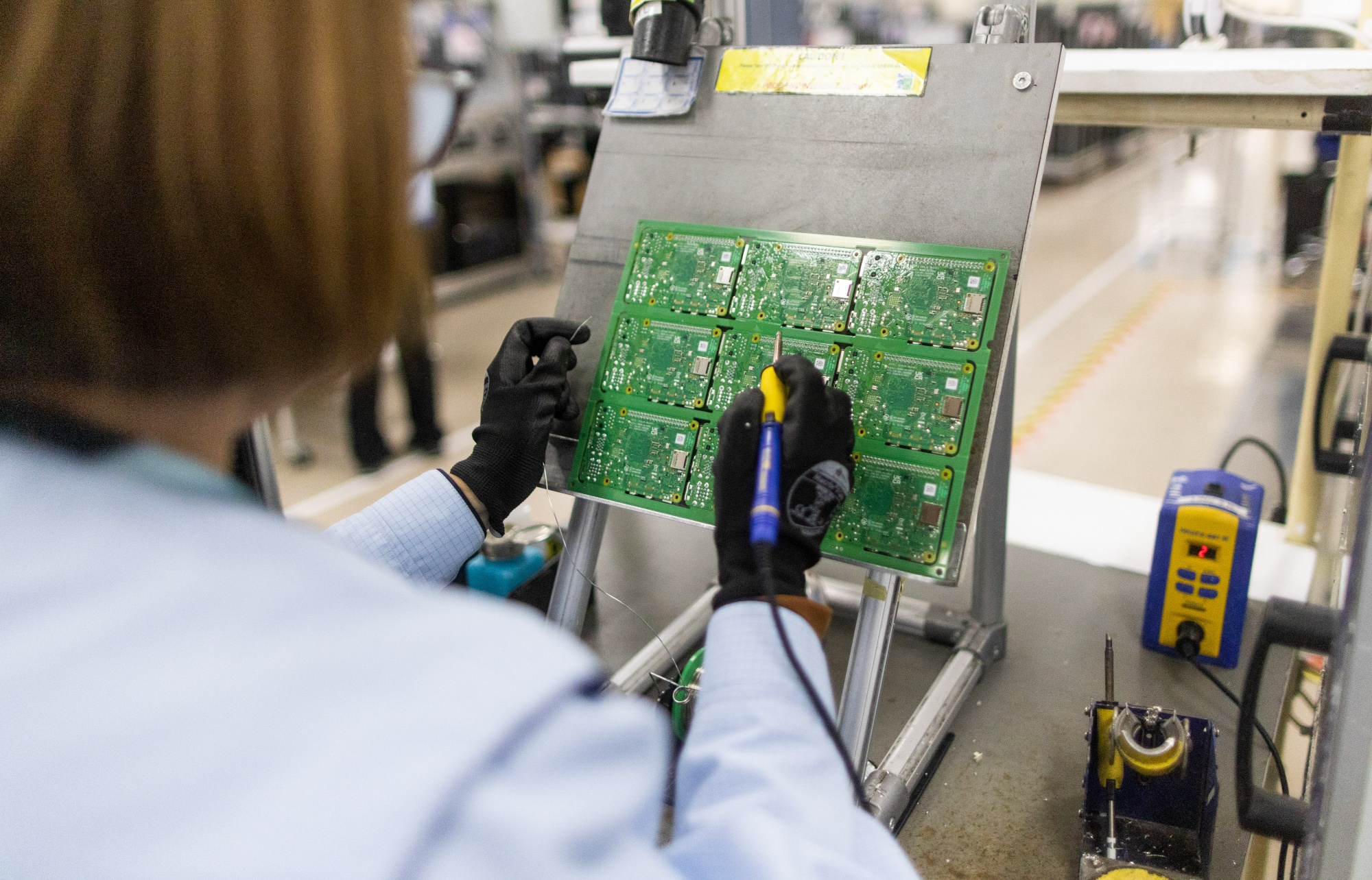 一名员工在树莓派个人电脑上进行质量控制检查。