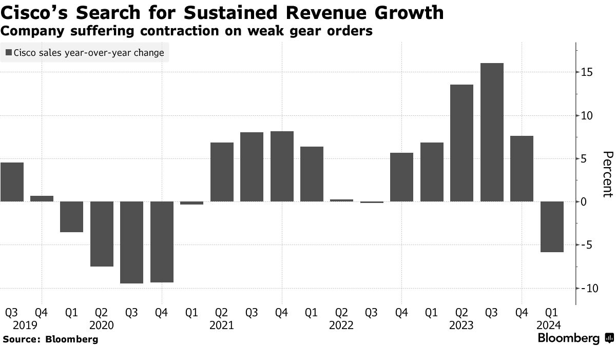 首席执行官查克·罗宾斯正在继续推动思科转型为网络服务和软件提供商——这一战略包括收购Splunk公司280亿美元。这一转变仍未完全使公司免受企业和电信公司客户硬件采购波动的影响。
