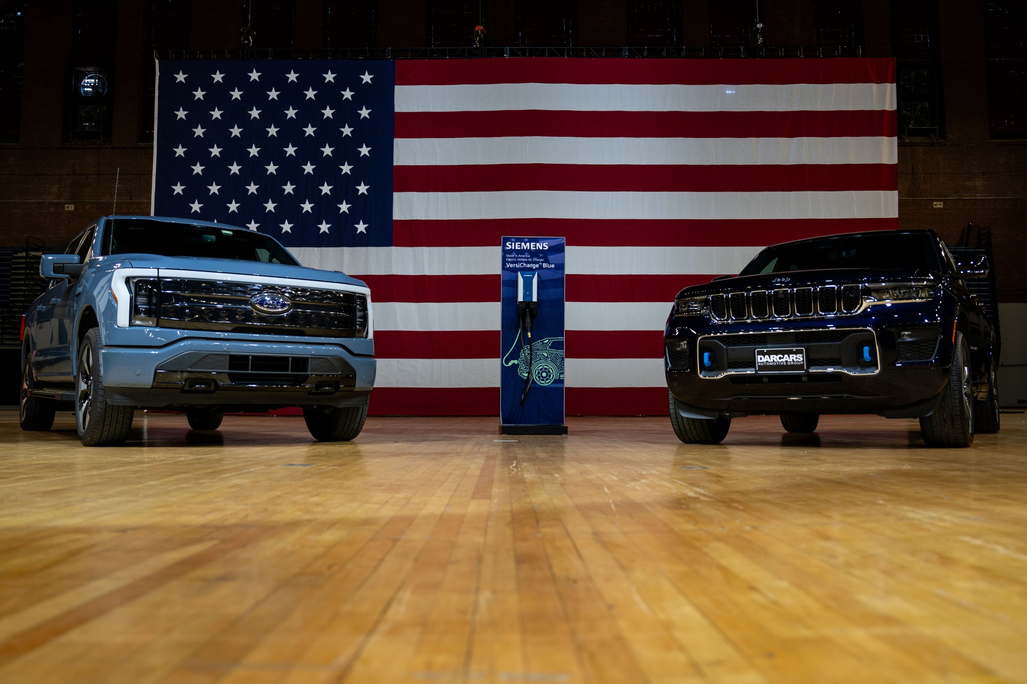 Ford F-150 Lightning,左,和 Jeep Grand Cherokee 4xe 电动汽车。摄影师:Kent Nishimura/Bloomberg不仅仅是日本汽车制造商更倾向于混合动力。Ford 汽车公司 计划将其 F-150 皮卡的混合动力版本产量翻倍,并降低价格 以匹配汽油车型。韩国的现代汽车公司据报道计划 使其在乔治亚州建造的电动汽车工厂也能够生产混合动力车。