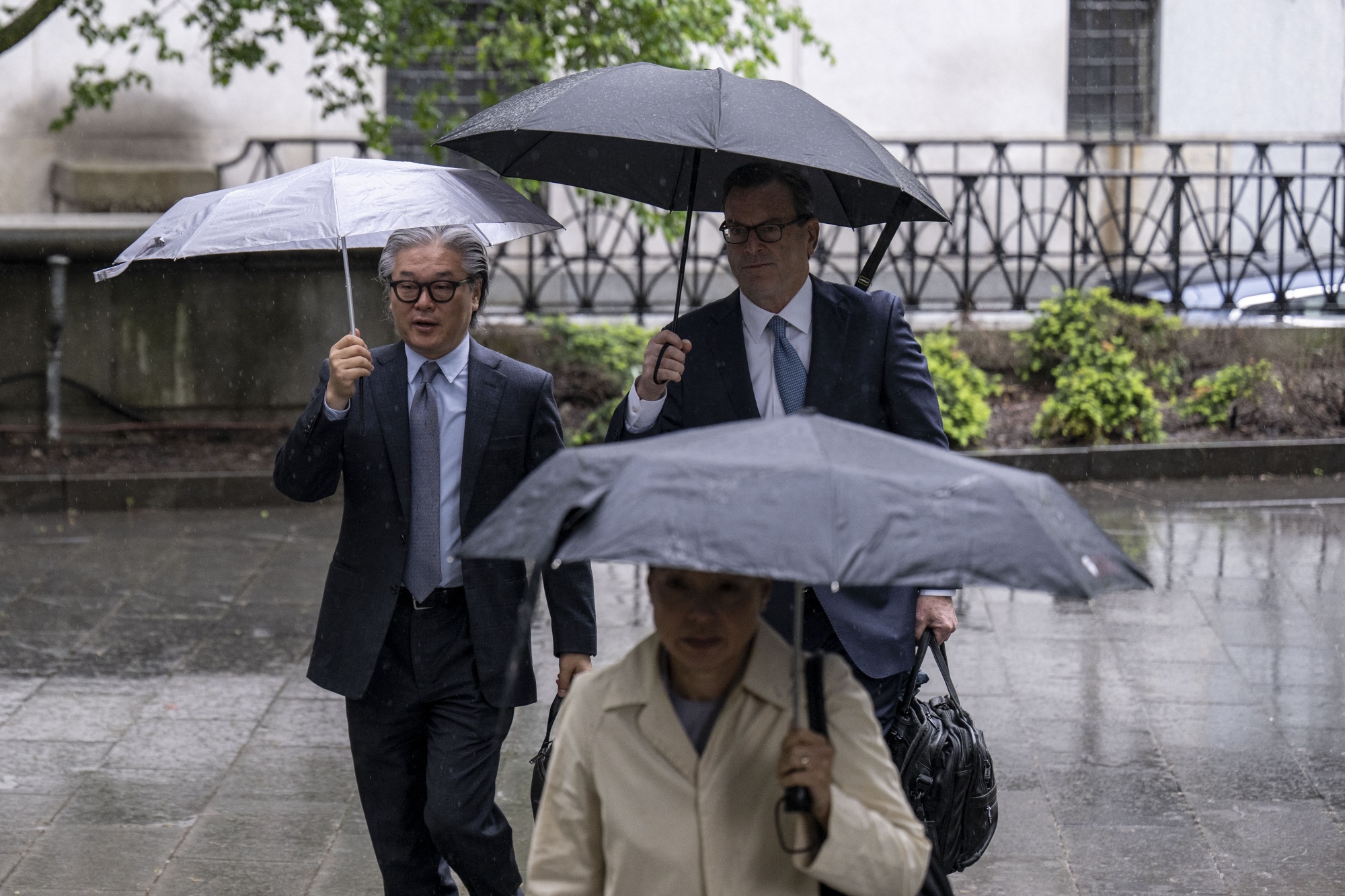 Bill Hwang 和律师巴里·伯克于 2024 年 5 月 15 日抵达曼哈顿联邦法院。摄影师:安吉拉·韦斯/AFP/盖蒂图片社