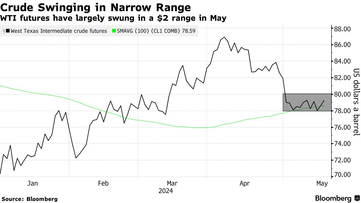 西德克萨斯中质原油上涨至79美元以上,尽管美国基准原油价格本月一直困在77美元至82美元之间。上周美国石油库存下降了250万桶,这是自3月以来首次连续下降,使全国持有量降至近一个月的最低水平。