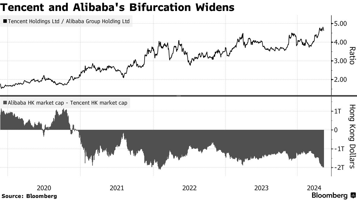 腾讯、阿里巴巴股价分歧在财报后继续扩大——彭博报道