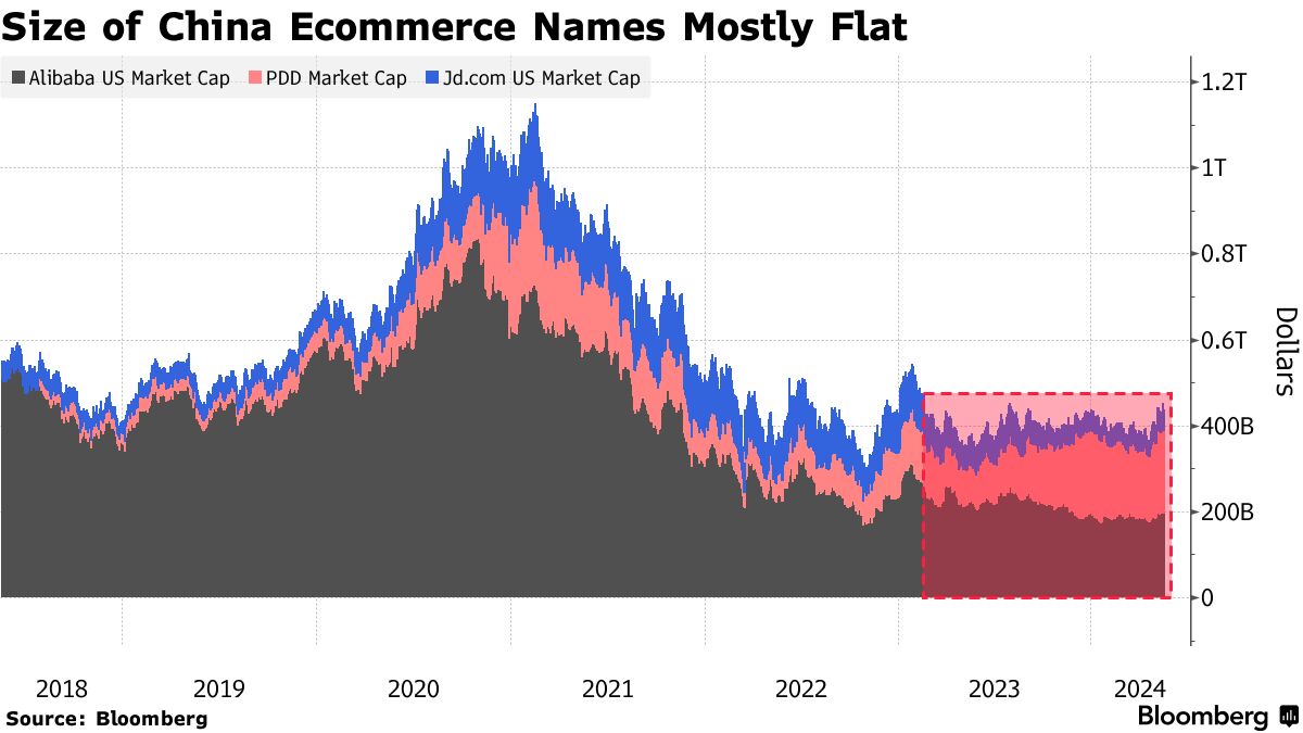 中国顶级三大电商平台的市值自去年以来保持稳定,即使阿里巴巴表现不佳。这凸显了该公司在该行业中的权重正在减小,而 PDD控股有限公司 却日益受到关注。