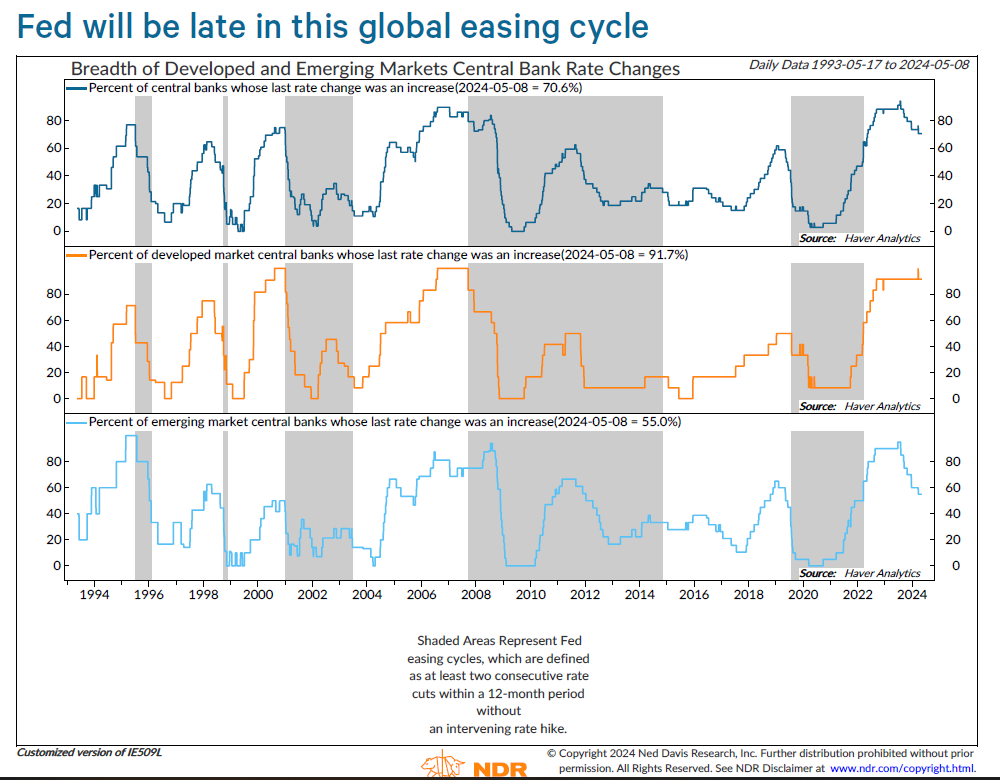 历史上,中央银行跟随美联储宽松周期的做法是合理的 —— 唯一的例外是1998年。在瑞典央行和瑞士国家银行最近的降息之后,今年出现了与美联储背道而驰的情况。在所有这些情况下,中央银行家们在超前于美联储之后,能够这样做是因为他们已经控制住了通货膨胀,并且也是对经济增长受到抑制做出的回应,但即便如此,当地货币的下行风险仍然是一个巨大因素。对其他中央银行来说,最好不要偏离美联储的立场。正如这张Ned Davis研究图表所显示的,中央银行在必要时采取了自己的行动: