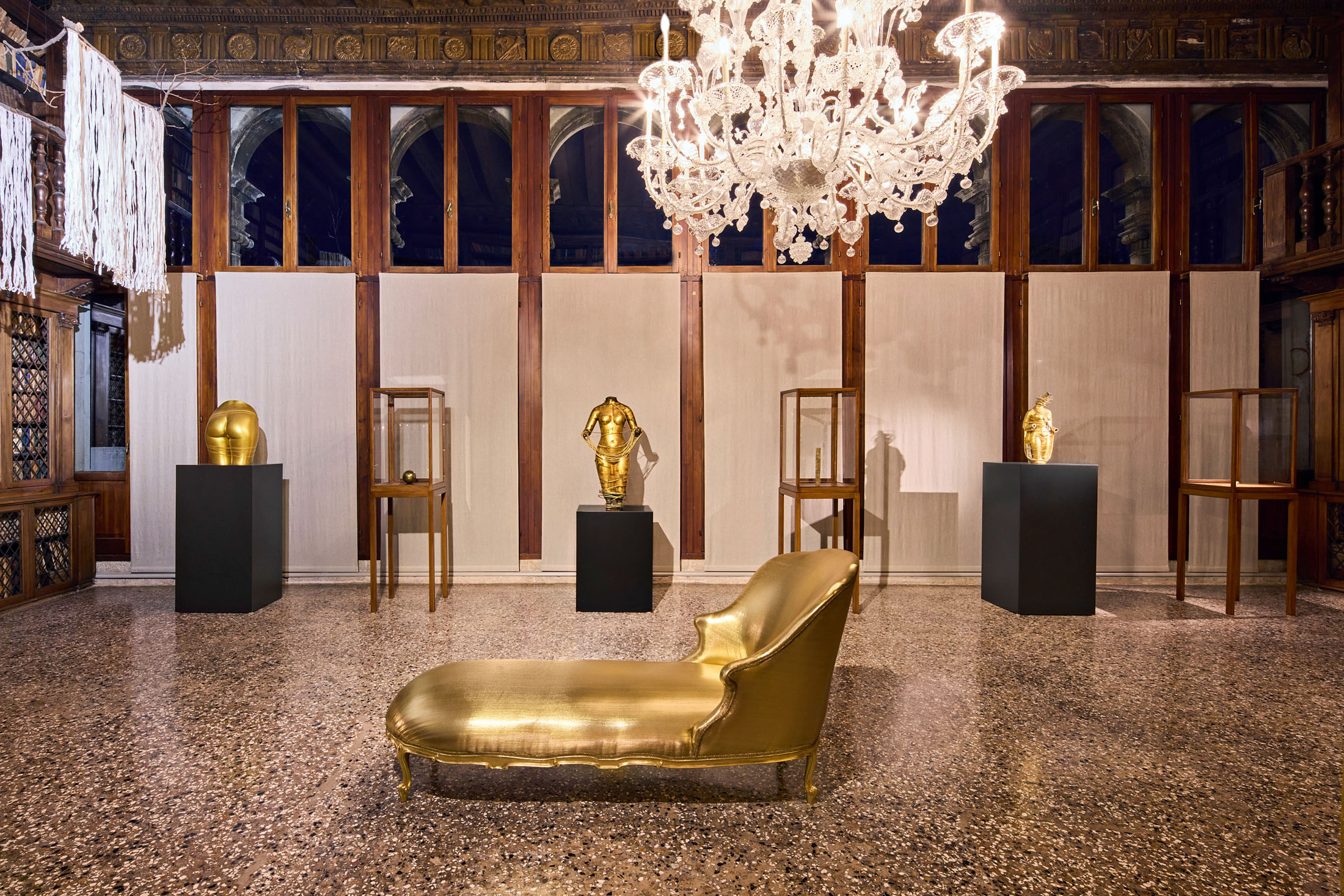 在历史悠久的洛雷丹宫内,俯瞰着圣斯特凡诺广场,你会发现这个被人津津乐道的展览。它将16世纪宫殿的华丽内部与拜尔斯和李的简约雕塑进行了对比——这两位艺术家虽然不相识,但他们的雕塑和概念作品常常结合了不寻常的材料。在每位艺术家长期创作的作品中,有一件李的雕塑看起来像是巨大的木珠,悬挂在一幅彩绘天花板上,旁边是一个双层的莫拉诺吊灯。在另一个房间里,一个看起来像是巨大金条的拜尔斯作品,闪闪发光,放置在棉花糖色的天花壁画下。这些作品本身常常难以解读,但在这个展览中,很容易找到艺术家创作之间的相似之处。