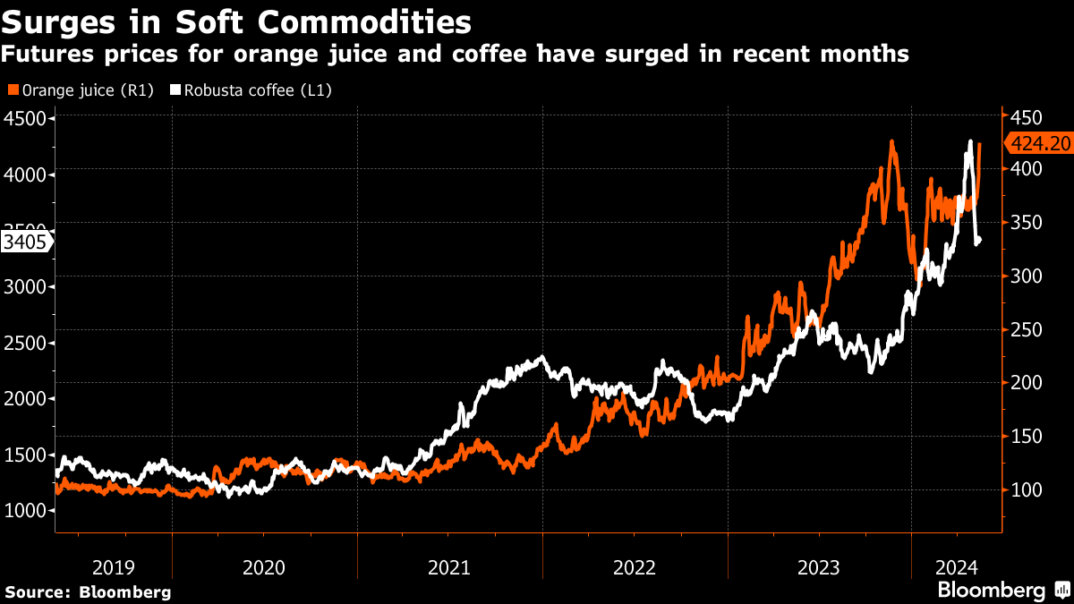 不稳定的天气模式也导致了其他软商品价格的上涨。本周,橙汁期货价格飙升至历史新高,预计巴西,世界上最大的橙汁出口国,将迎来36年来最糟糕的收成。与此同时,越南的干旱有助于推高罗布斯塔咖啡期货价格至四十多年来的最高水平。