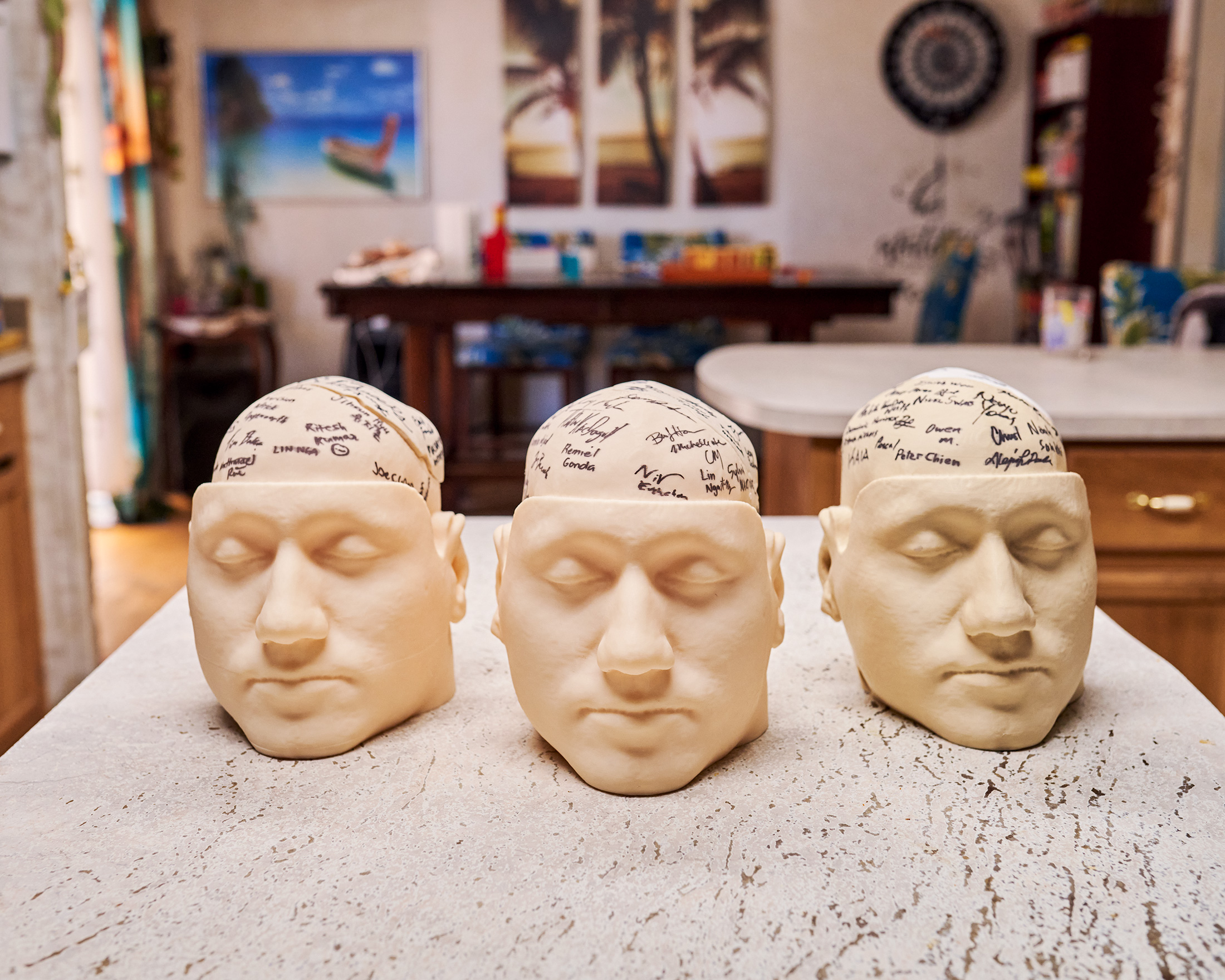 Neuralink团队的成员给了阿尔鲍这些签名的他头部的模型。摄影师:约翰·弗朗西斯·彼得斯,为彭博商业周刊拍摄作为马斯克的粉丝,阿尔鲍反驳了。他质疑了关于动物的故事的可信度。他还读过一篇关于马斯克在SpaceX首次将人类送入太空之前的行为的报道。马斯克当时无法入睡,为宇航员的安全祈祷,尽管他并不是一个信仰虔诚的人。“那真的让我放心了,”阿尔鲍说。“这让我觉得他不会做这件事,如果他觉得会有不好的结果的话。”