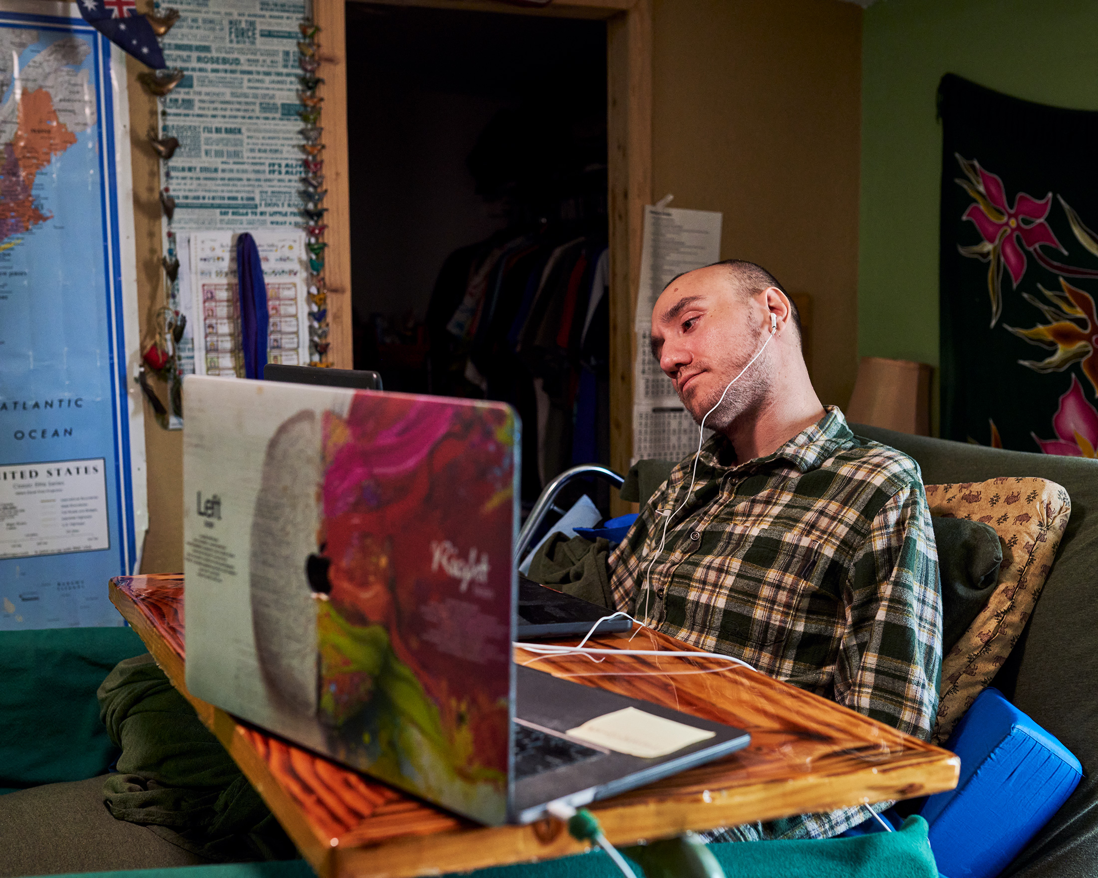 在湖边发生的事故彻底改变了这位22岁年轻人的生活。他不得不学会如何在他的电动轮椅上移动,通过吸气和呼气来控制一个管子,以不同的力量使机器朝不同方向移动。他还得弄清楚如何用嘴里拿着的棍子戳iPad来使用电脑。他和他的家人花了很多时间处理医院、保险公司和护理人员。