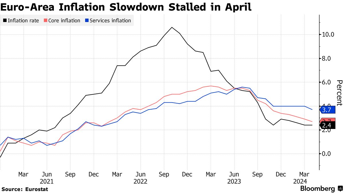 欧元区通胀最近出现回落,4月份停滞在2.4%,而经济在年初增长超出预期,这可能使政策放松的紧迫性降低。欧洲委员会周三表示,欧洲仍在实现软着陆,通胀回落速度比先前预期更快。