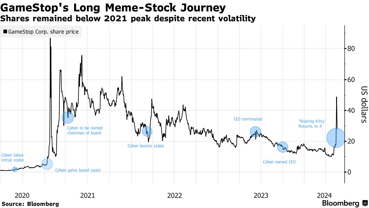 这种波动让人想起了2021年初迷因股票的鼎盛时期,当时零售交易者抓住了这家视频游戏零售商和备受困扰的电影院连锁企业,将两家公司的股票推至创纪录的高位。Keith Gill在2021年以“Roaring Kitty”网名活跃于Reddit上,团结交易者支持GameStop。他在X账号上发布的一篇周日帖子帮助引发了最新一轮波动。