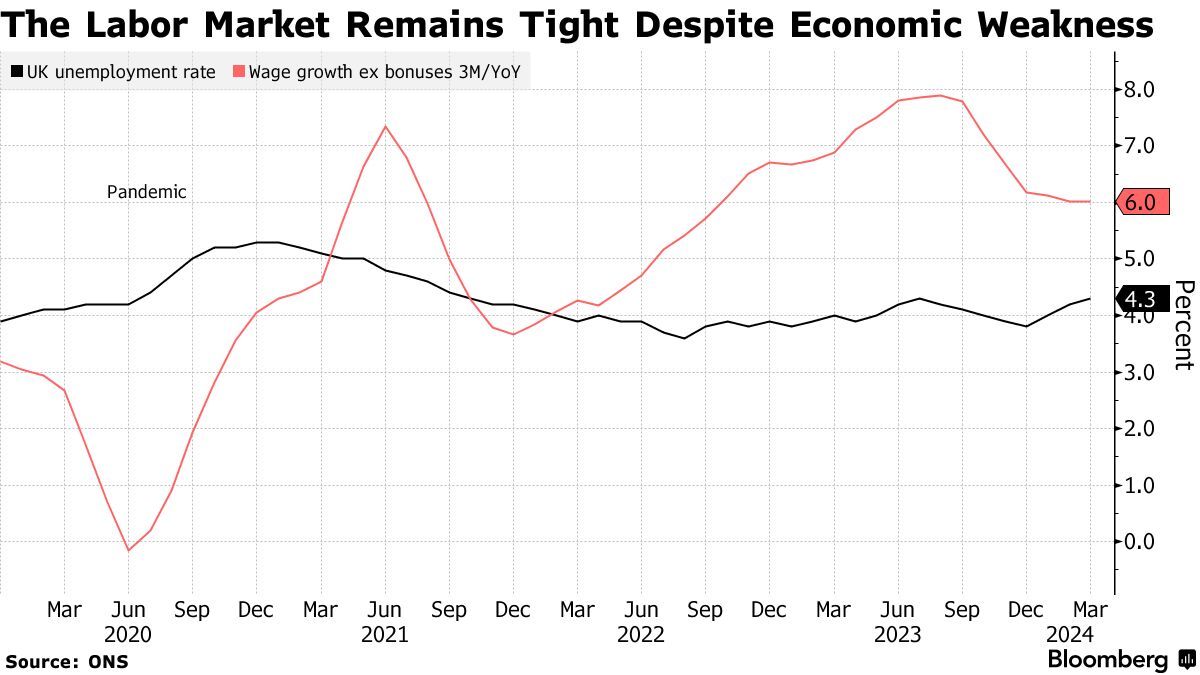 英国银行在5月份的会议上接近自疫情爆发以来的首次降息。然而,会议纪要显示,货币政策委员会对于基础价格压力是否足够降温以在夏季降息存在广泛观点分歧。鹰派利率制定者,包括格林、乔纳森·哈斯克尔和凯瑟琳·曼恩,已经表达了他们对劳动力市场紧张程度的担忧。
