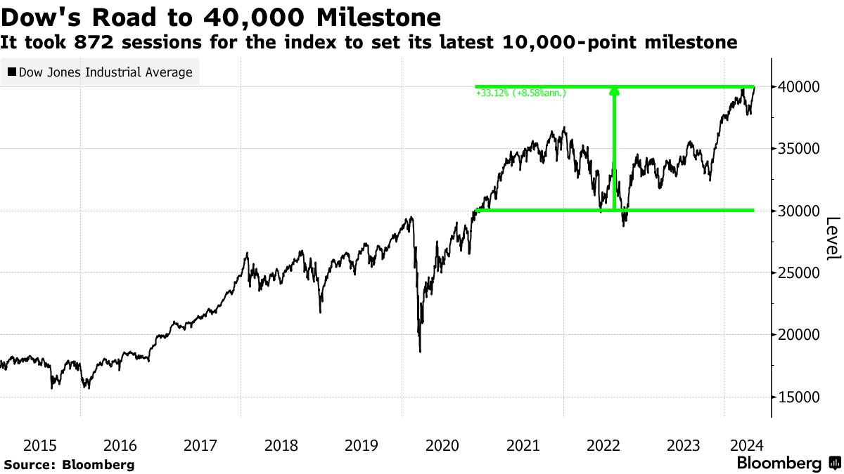 华尔街三大主要股指中最古老的那个受益于美国经济弹性的前景、通胀回落和强劲的企业盈利。根据彭博社编制的数据显示,截至周三的872个交易日,道指创下了最新的10,000点里程碑,涨幅为33%,指数收复了过去两年美联储大幅加息所带来的所有损失。