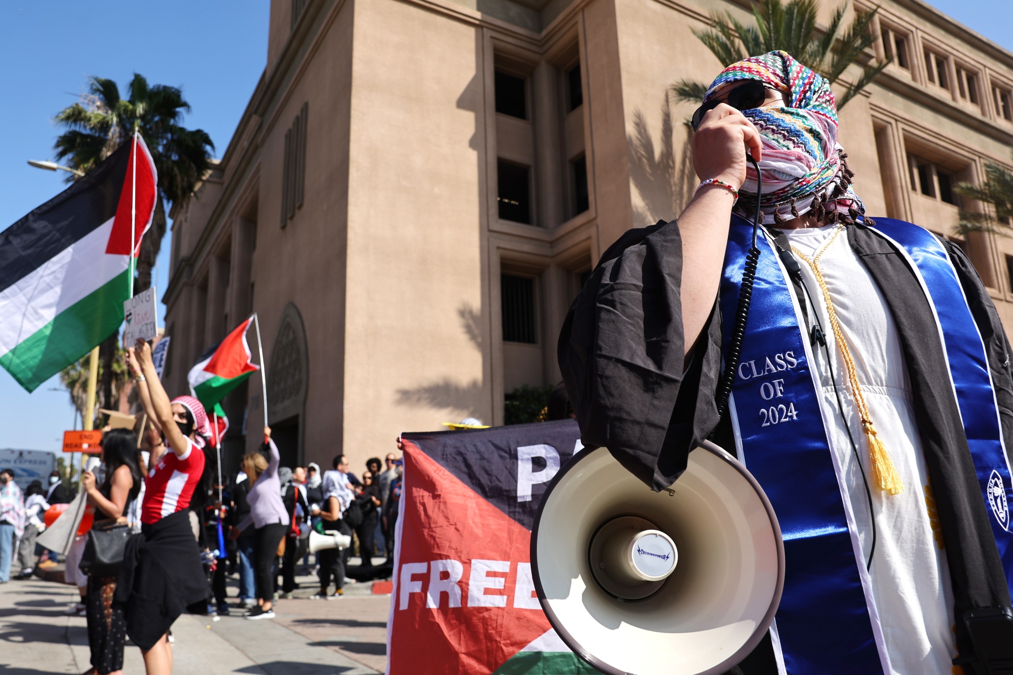 亲巴勒斯坦的抗议者在2024年5月12日于加利福尼亚州洛杉矶的圣殿礼堂举行的蓬纳学院毕业典礼入口处举行示威活动。