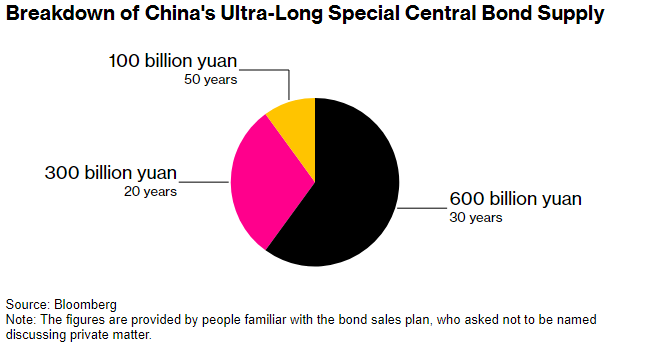 渴望通过增加财政支出来刺激经济的投资者也终于得到了回应。中国将于周五开始出售其1万亿元超长特别国债的第一批。这结束了数月来对这些国债 —— 这是26年来仅有的第四次发行 —— 何时推出的猜测。