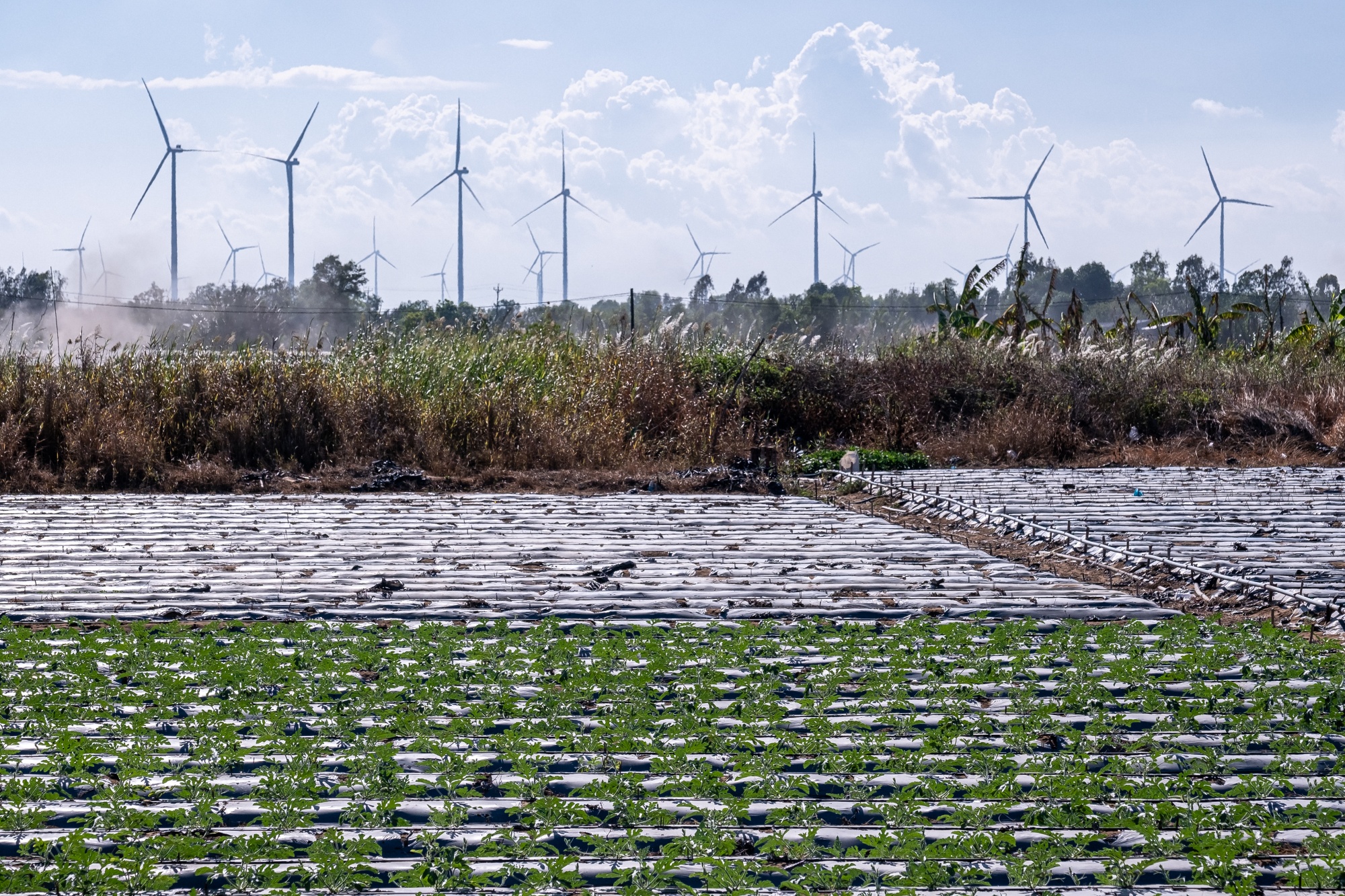 越南梭克廖省文珠镇农田外的风力涡轮机,2024年4月26日星期五。