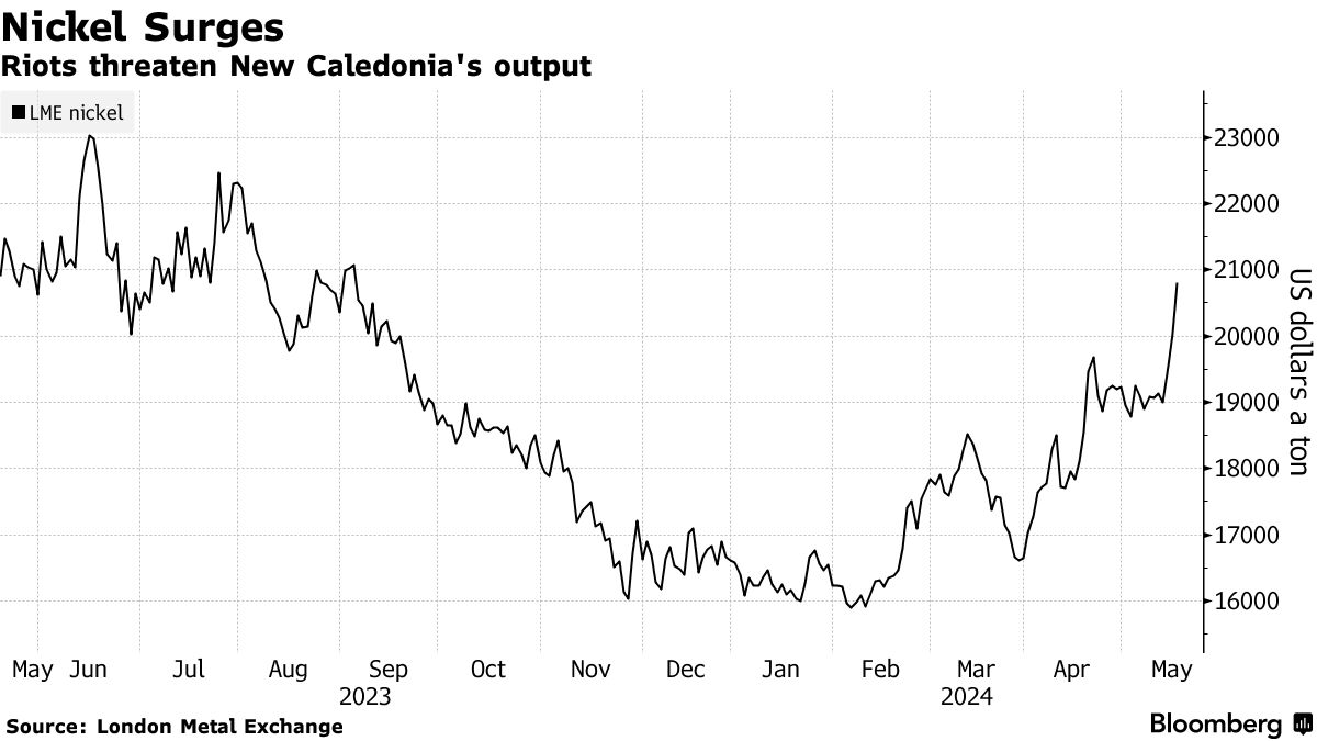 摄影师:路易斯·塔托/AFP尼克尔上涨超过5% — 是一个月以来最大涨幅 — 因努美阿的动荡引发了对来自法属领土供应进一步中断的担忧。