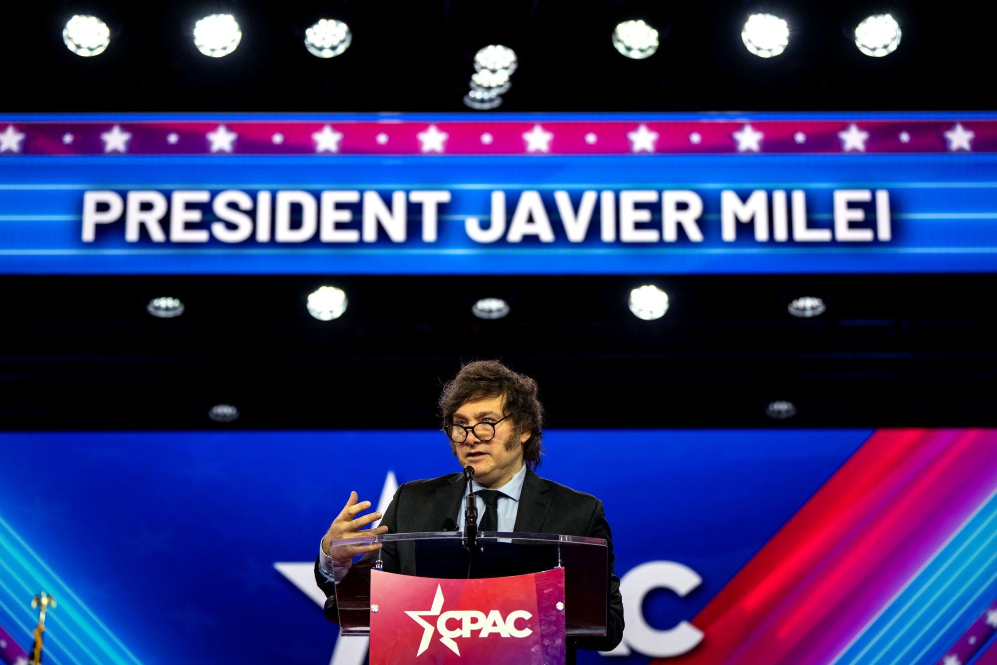 阿根廷总统哈维尔·米莱在美国马里兰州国家港的保守政治行动大会(CPAC)上发言,日期为2024年2月24日。摄影师:肯特·西村拉/彭博社