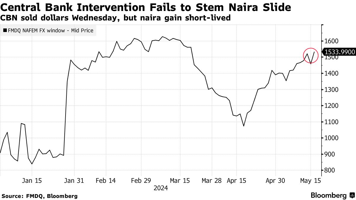 本周央行干预未能阻止尼日利亚奈拉下跌至两个月低点,此前是周一的利率决定。