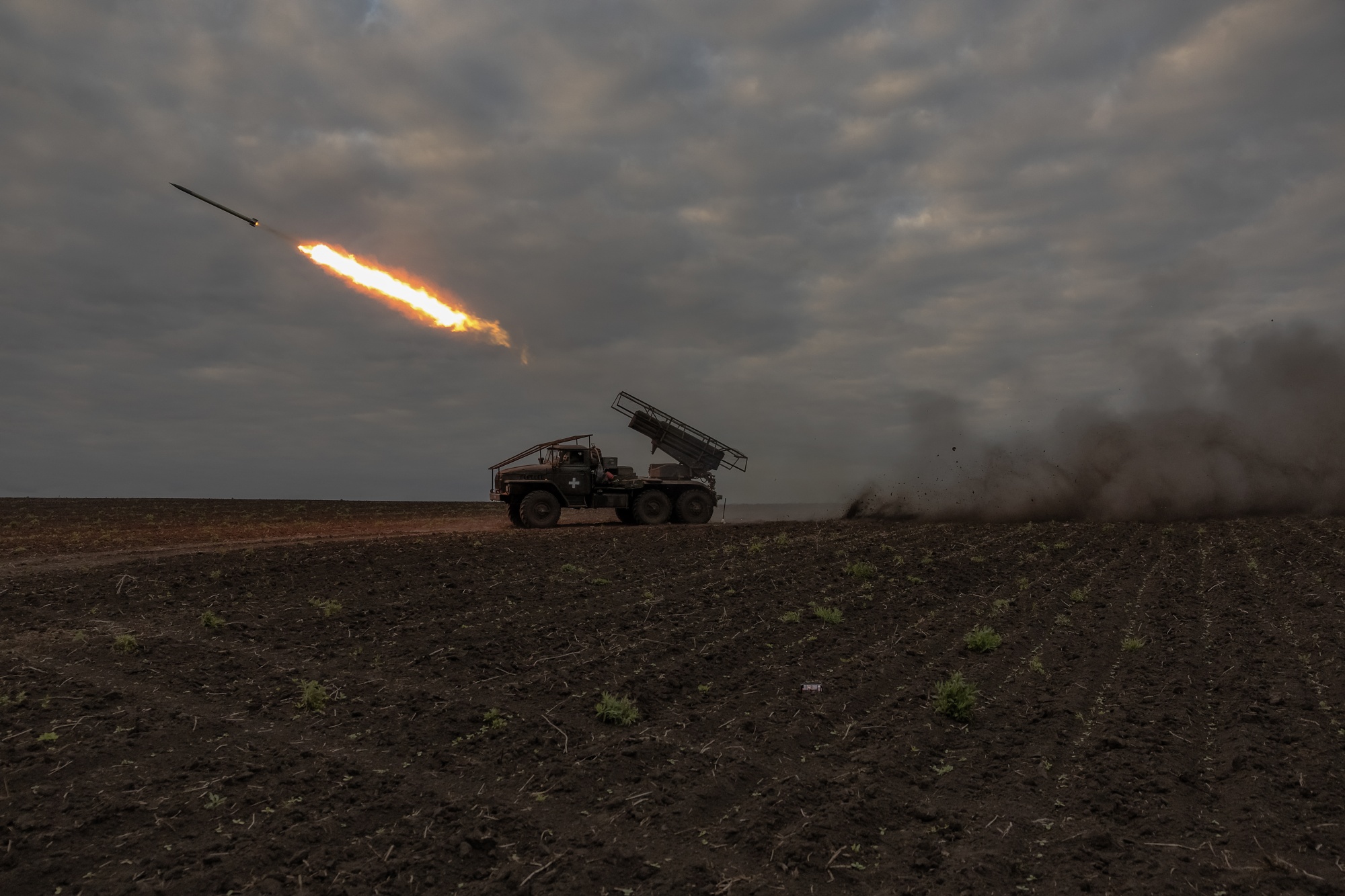 乌克兰军人向哈尔科夫地区的俄罗斯阵地发射多管火箭发射器,时间为5月15日。摄影师:Roman Pilipey/AFP/Getty Images