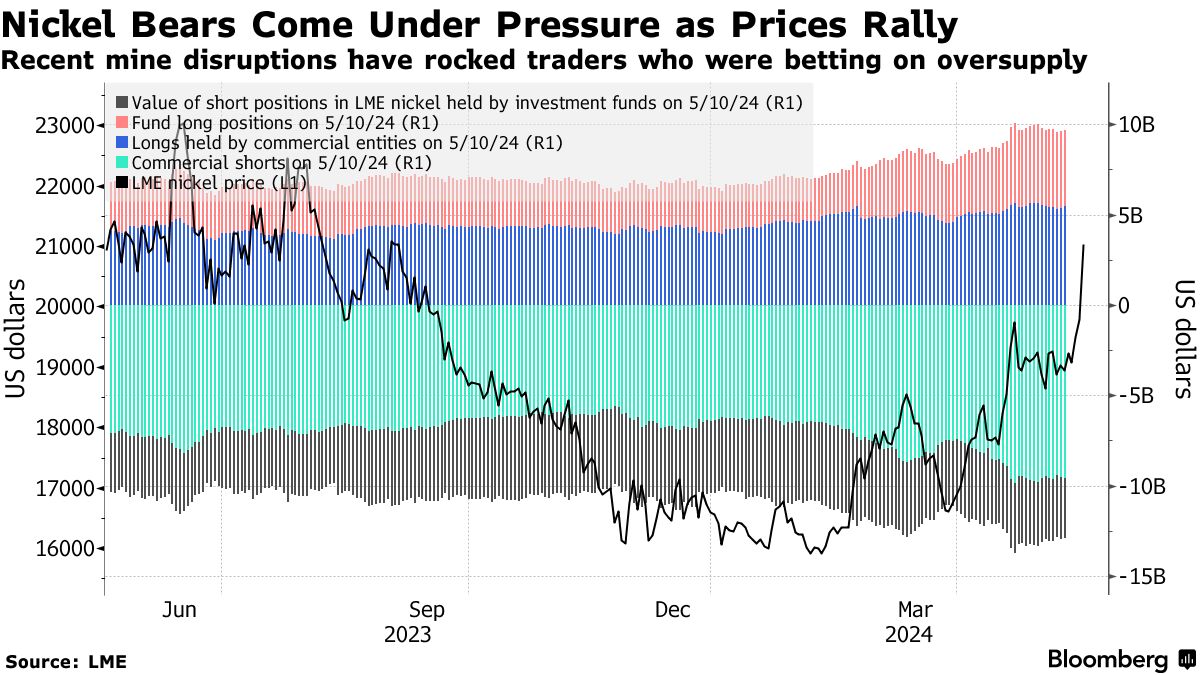 供应中断让许多交易者措手不及,这帮助推动了持有空头头寸的人争相平仓,导致价格大幅波动。在新喀里多尼亚爆发暴力抗议活动后,镍价在伦敦金属交易所(LME)上涨了多达7.9%。