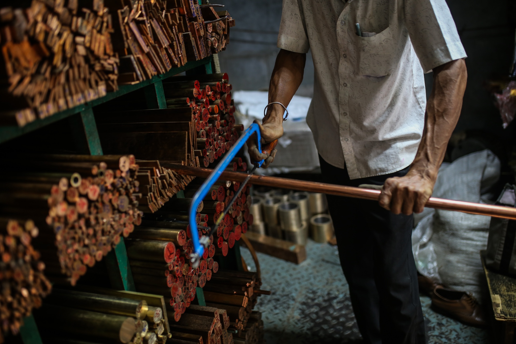一名工人在印度孟买的批发金属经销商处切割铜管。