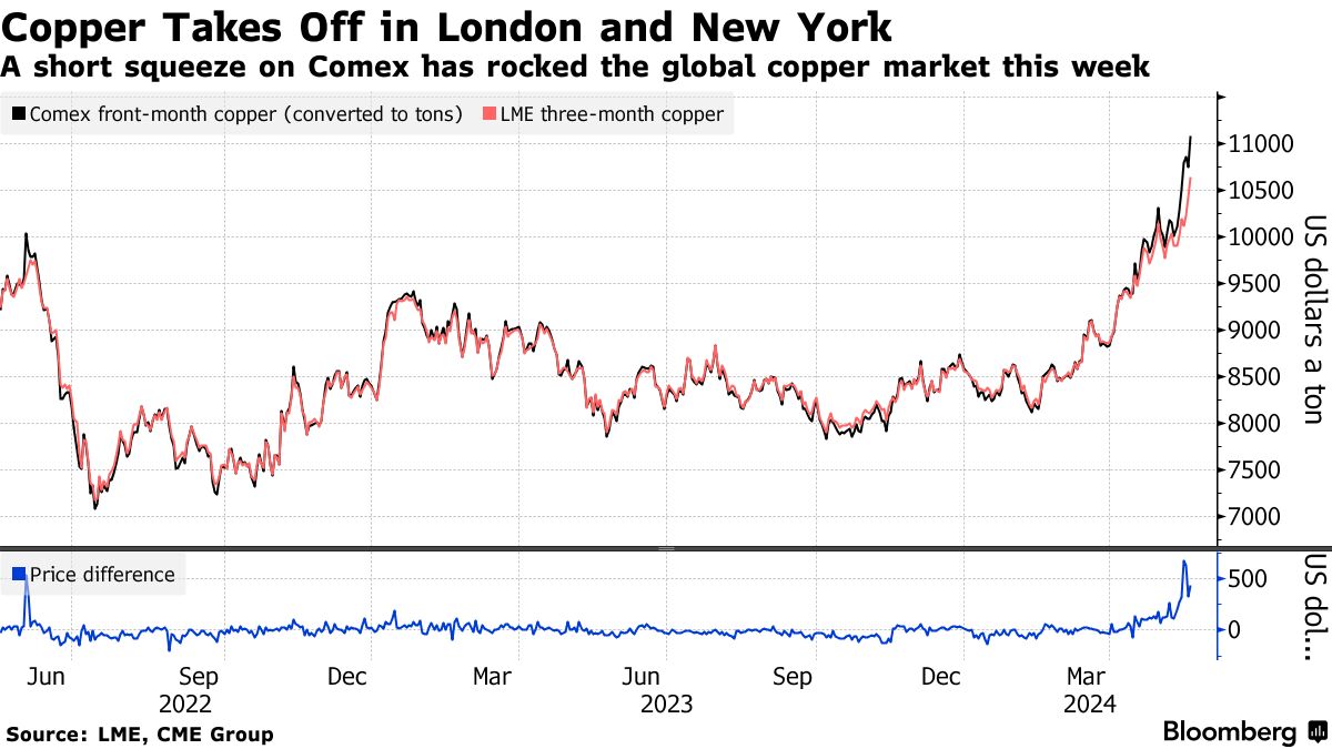 伦敦金属交易所的全球基准铜合约周五飙升了多达2.8%,接近2022年3月创下的历史最高水平。本周,铜价已在纽约和上海创下纪录,全球市场受到围绕Comex交易所的空头挤压的冲击。