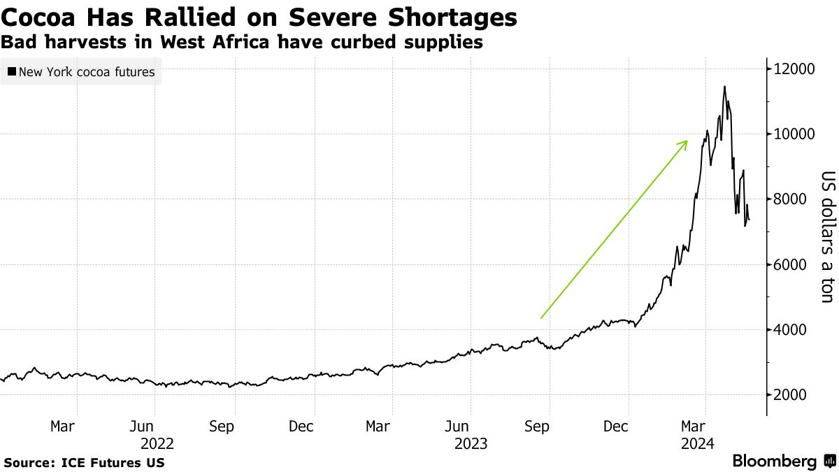 可可期货价格从4月中旬创下的高点有所回落,但今年迄今为止仍上涨超过70%。这一涨势促使象牙海岸和加纳提高农民工资,但仍低于全球价格。