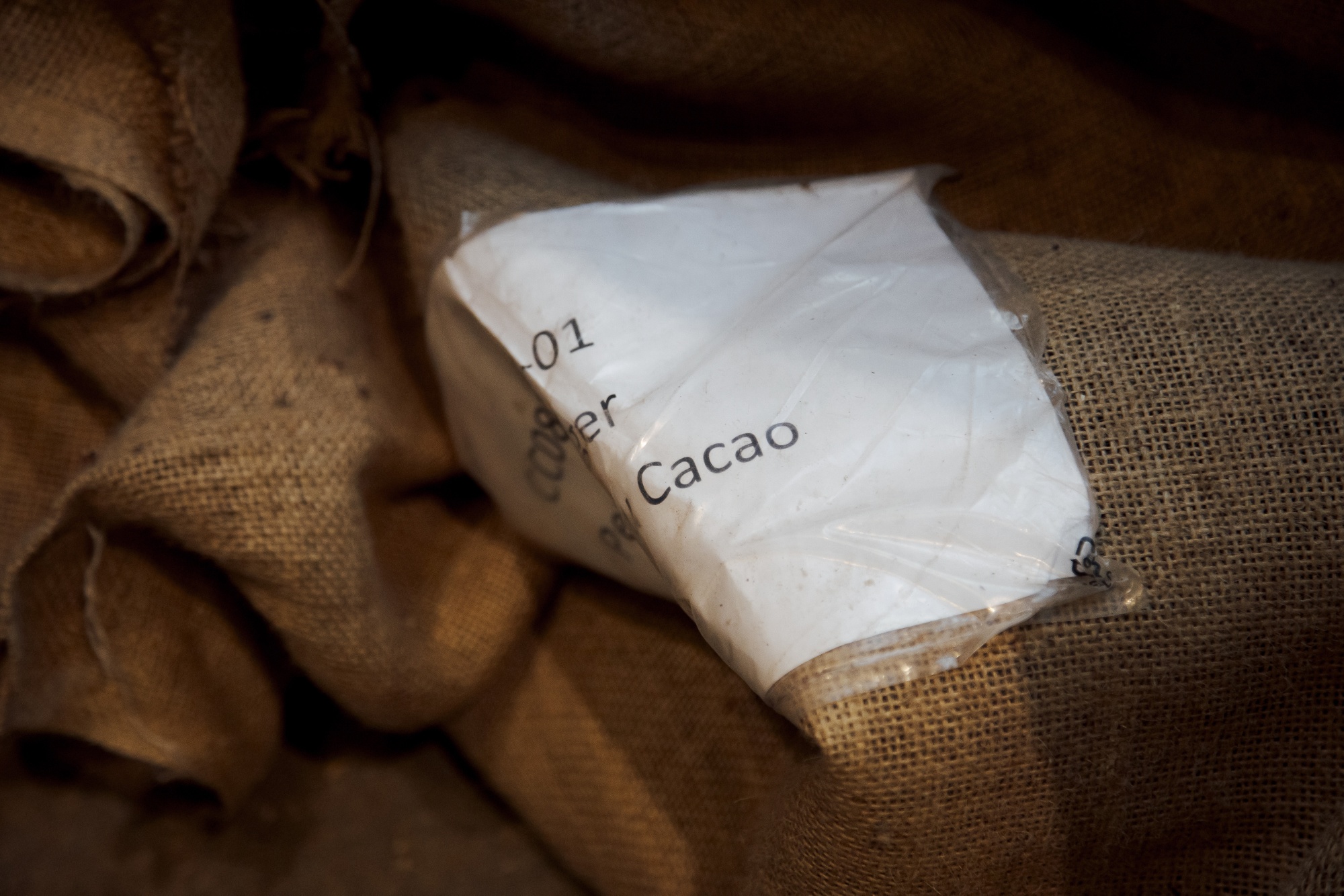 在法国巴黎Alain Ducasse的巧克力工厂,一袋生可可豆上的标签。