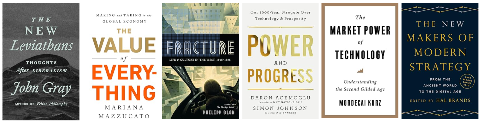 他推荐了约翰·格雷的 新利维坦:自由主义之后的思考,玛丽安娜·马祖卡托的 一切的价值:全球经济中的创造与占有,菲利普·布隆的 裂痕:1918-1938年西方的生活与文化,权力与进步:我们千年来对技术和繁荣的斗争,达伦·阿塞莫格鲁和西蒙·约翰逊的,莫德凯·库尔兹的 技术的市场力量:理解第二个镀金时代,最后,哈尔·布兰德的现代战略的新创作者:从古代世界到数字时代。