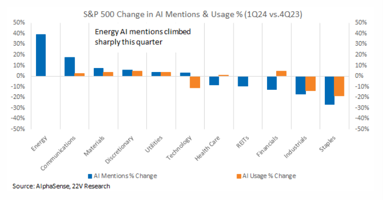 根据22V研究,与上个盈利季度相比,能源行业在提及人工智能方面增长最快。工业和主食行业显示出较低的人工智能兴趣。
