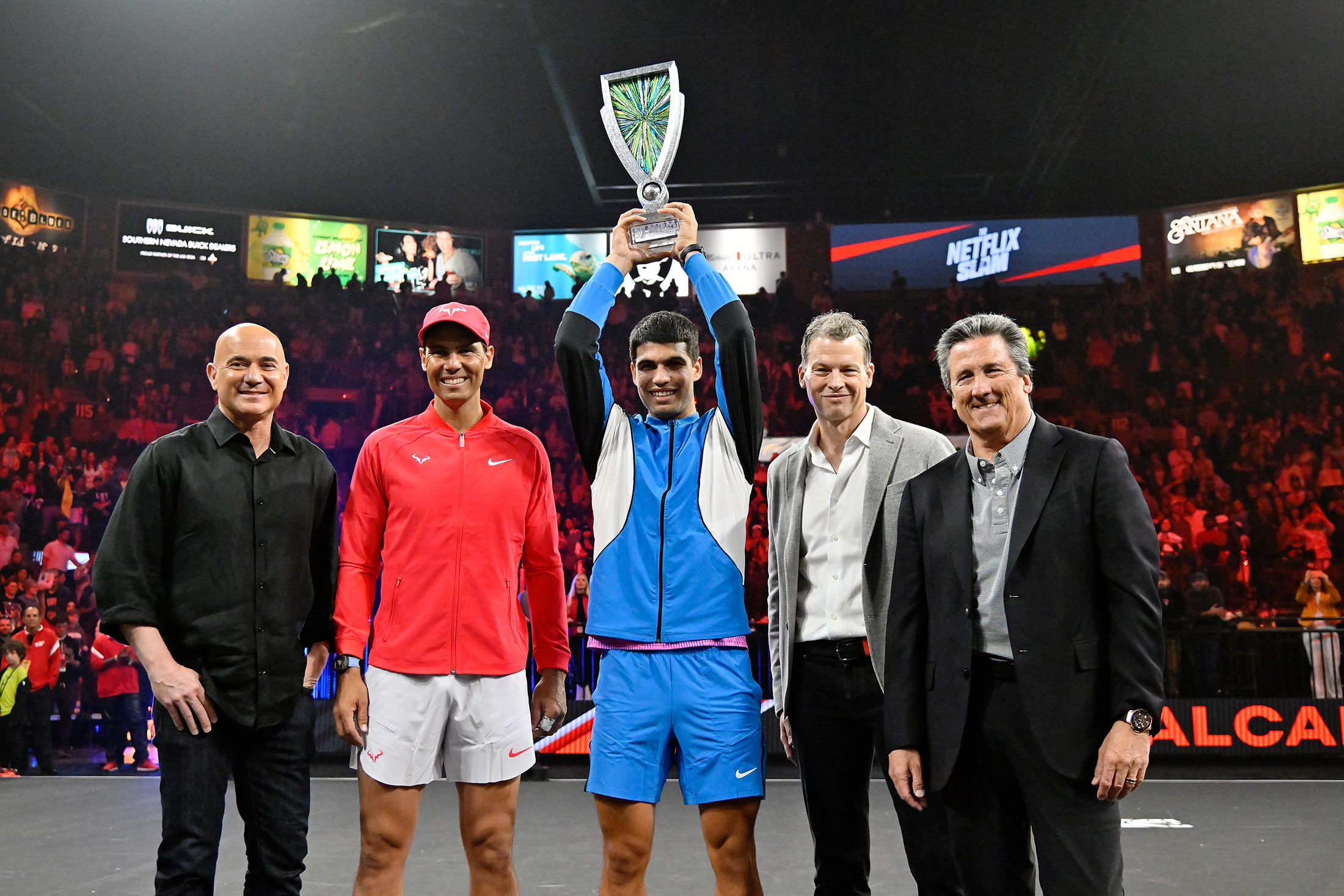 安德烈·阿加西、拉斐尔·纳达尔、卡洛斯·阿尔卡拉斯、彼得斯和MGM度假村国际首席执行官威廉·霍恩巴克尔在Netflix Slam上。摄影师:大卫·贝克尔/盖蒂图片社3月3日,彼得斯坐在拉斯维加斯的米歇洛布超级竞技场的场边,仍然兴奋不已。 他一大早就和西班牙网球明星拉斐尔·纳达尔和卡洛斯·阿尔卡拉斯一起打球。 现在,坐在妻子、女儿和几个同事旁边,彼得斯看着纳达尔和阿尔卡拉斯在曼德勒湾赌场的黑色球场上交换底线球。 彼得斯是一个狂热的网球运动员,他分析了两位选手风格的对比:老练的纳达尔仍在从臀部受伤中恢复,这限制了他的移动能力,但没有影响他的标志性顽强。 阿尔卡拉斯,全是力量和速度,是这项运动新一代的领袖。