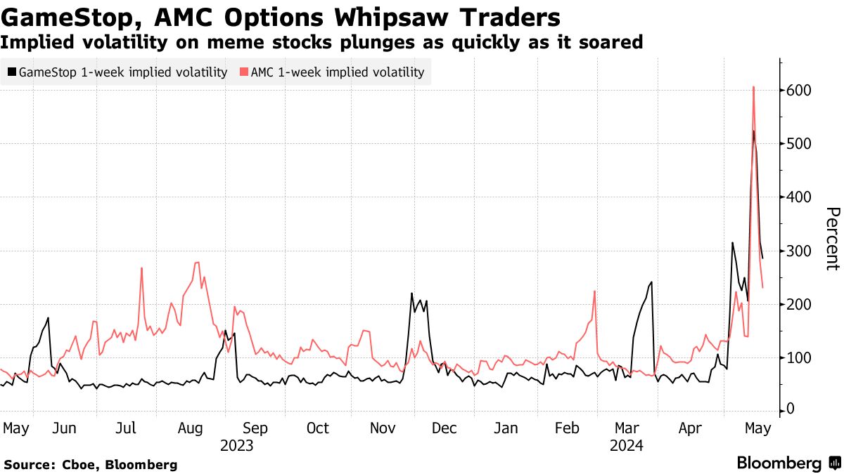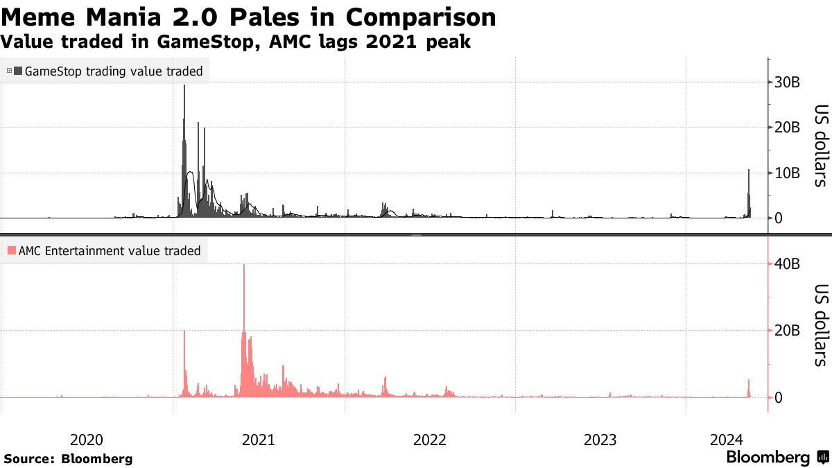 2024年的模因股票瞬间的一个方面是它是多么短暂,零售交易者的跟进不足。是的,GameStop在本周初看到的交易股票数量超过了其最近平均水平的10倍,而AMC在五天内的交易量超过了17亿股,但名义价值与2021年相比微不足道。