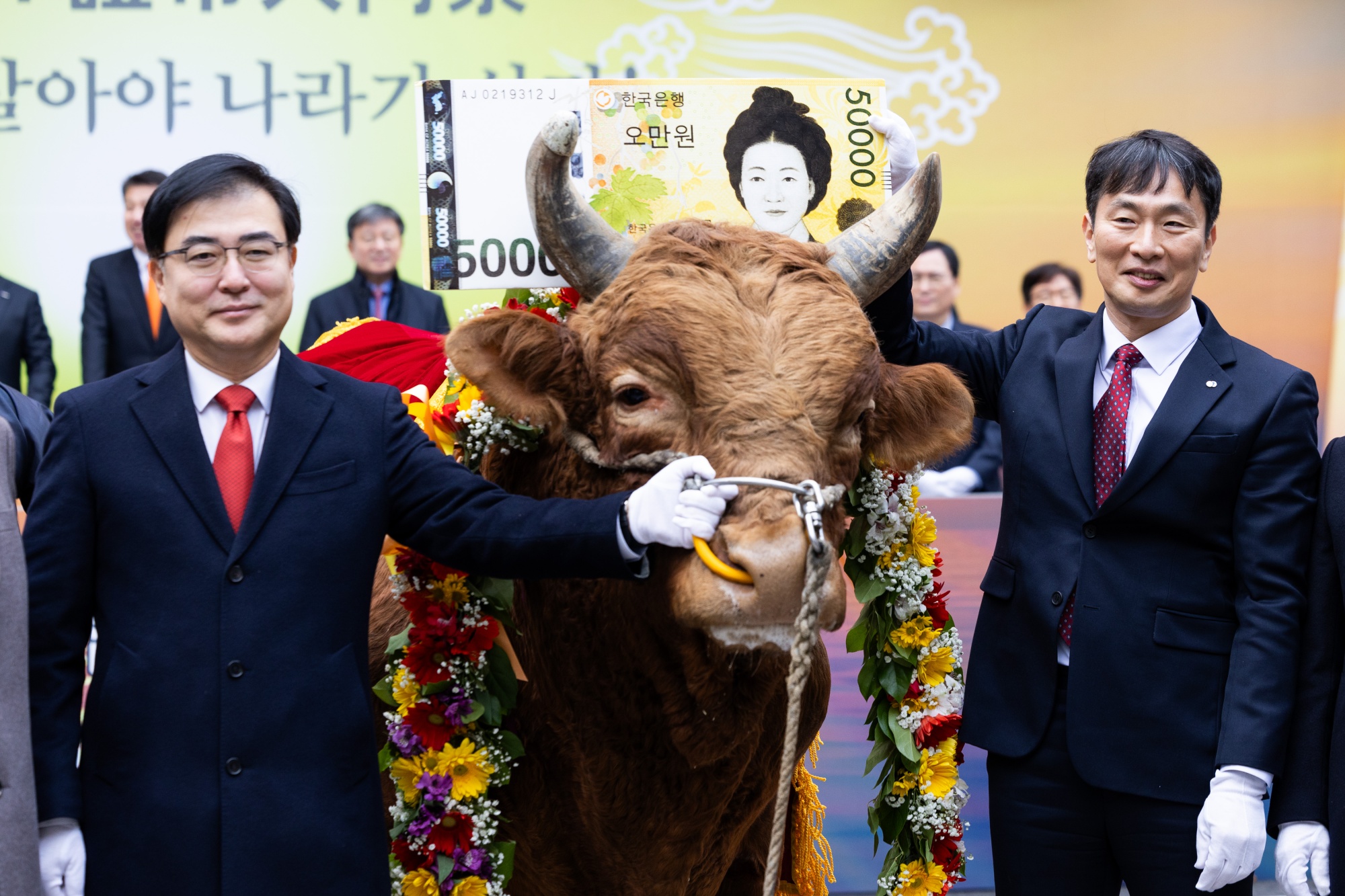 李福贤,金融监督局长,右,庆祝首尔韩国交易所的新年第一天。