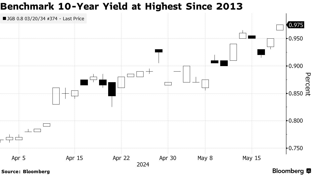 周一,10年期政府债券收益率上涨2.5个基点,达到0.975%,这一水平最后一次出现是在当时新任日本央行行长黑田东彦开始实施激进货币宽松政策时。