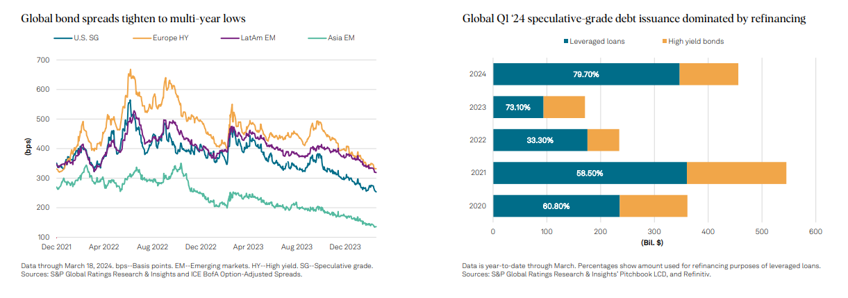 也许受限制的供应帮助,美国投机级债券的利差在3月份达到了历史最低的246个基点。这一趋势不仅限于美国,如标普全球的图表所示:
