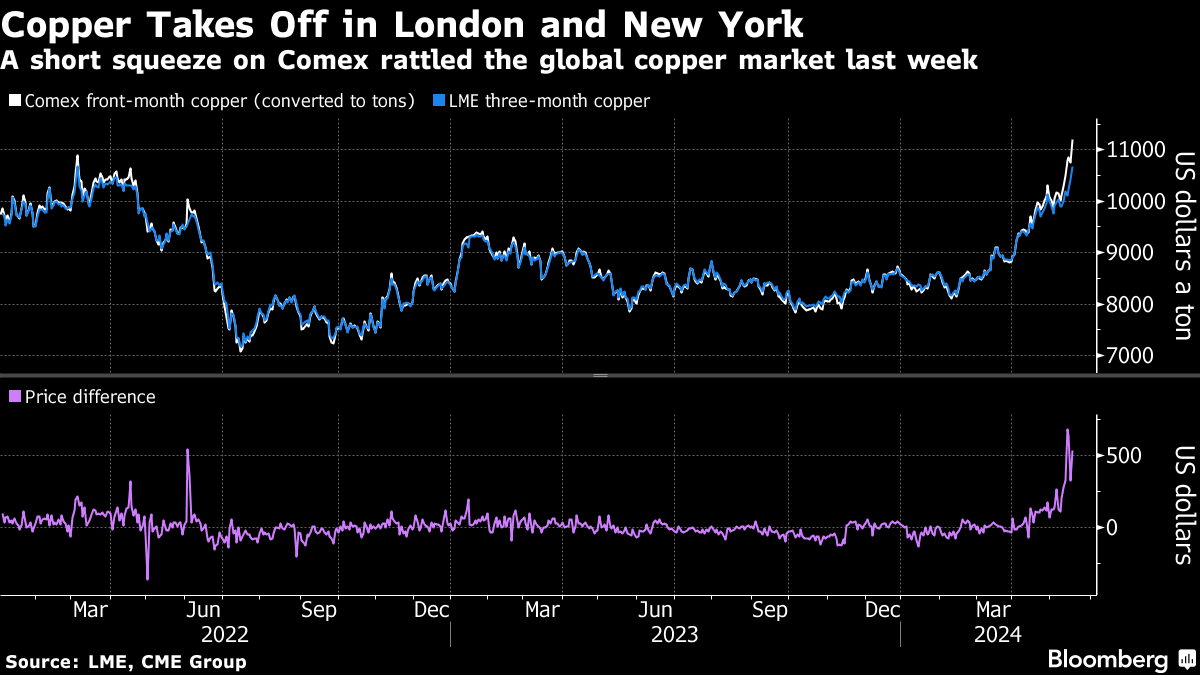 部分原因是,美国的铜库存较低。这也将推动价格上涨。投机市场因素正在加剧这一情况,交易员正在进行“抛空压力”,押注收益将迫使那些押注亏损的人屈服并进一步推高价格。结果是伦敦和纽约市场之间出现了明显的分歧: