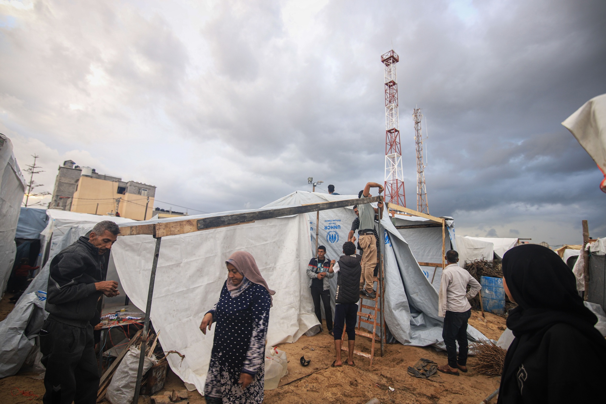 被迫流离失所的巴勒斯坦人在加沙汉尤尼斯由联合国救济和工程处运营的营地建造临时住所。