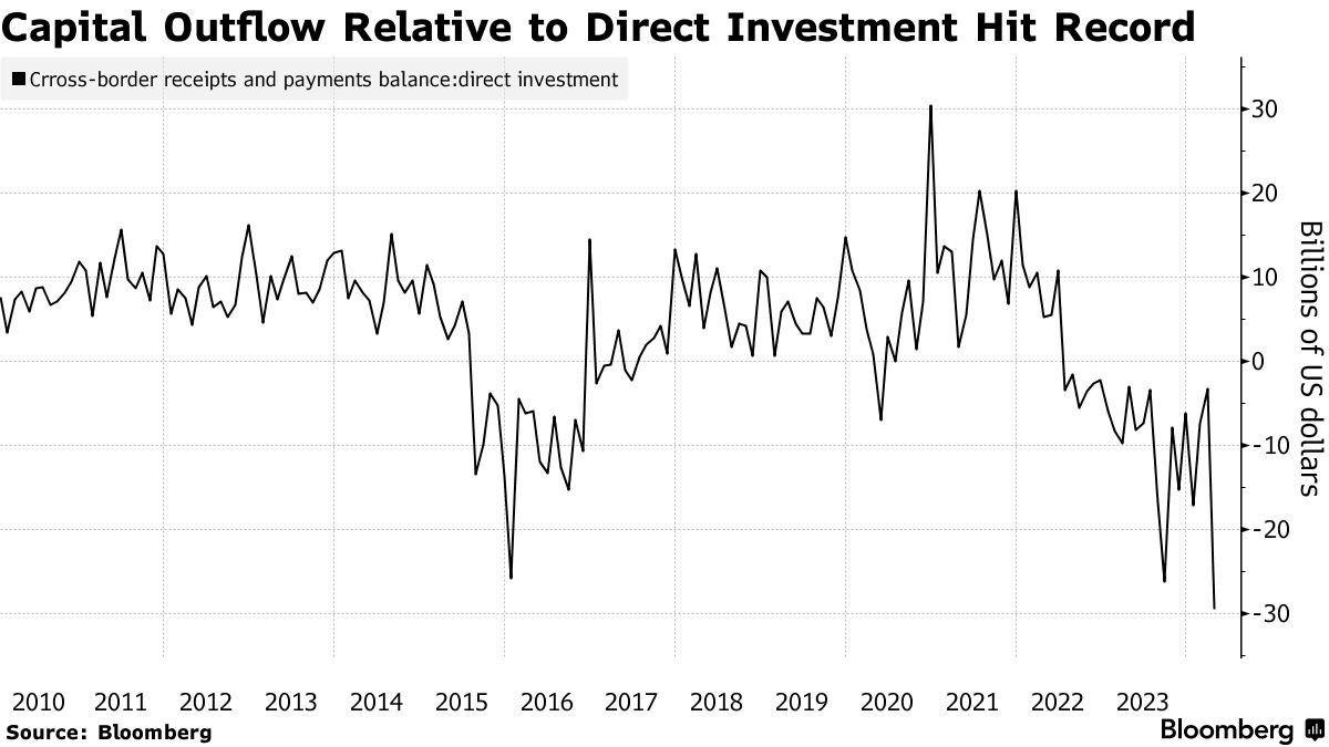 中国外商直接投资流入的暴跌可能更多地反映了美国相对较高的利率,而不是外国企业对中国失去兴趣,彭博分析师杰拉德·迪皮波在上周的一份报告中写道。包括在香港设有办事处的中国企业在内的非居民企业可能已将现金转移到海外以获得更高的收益,他写道。
