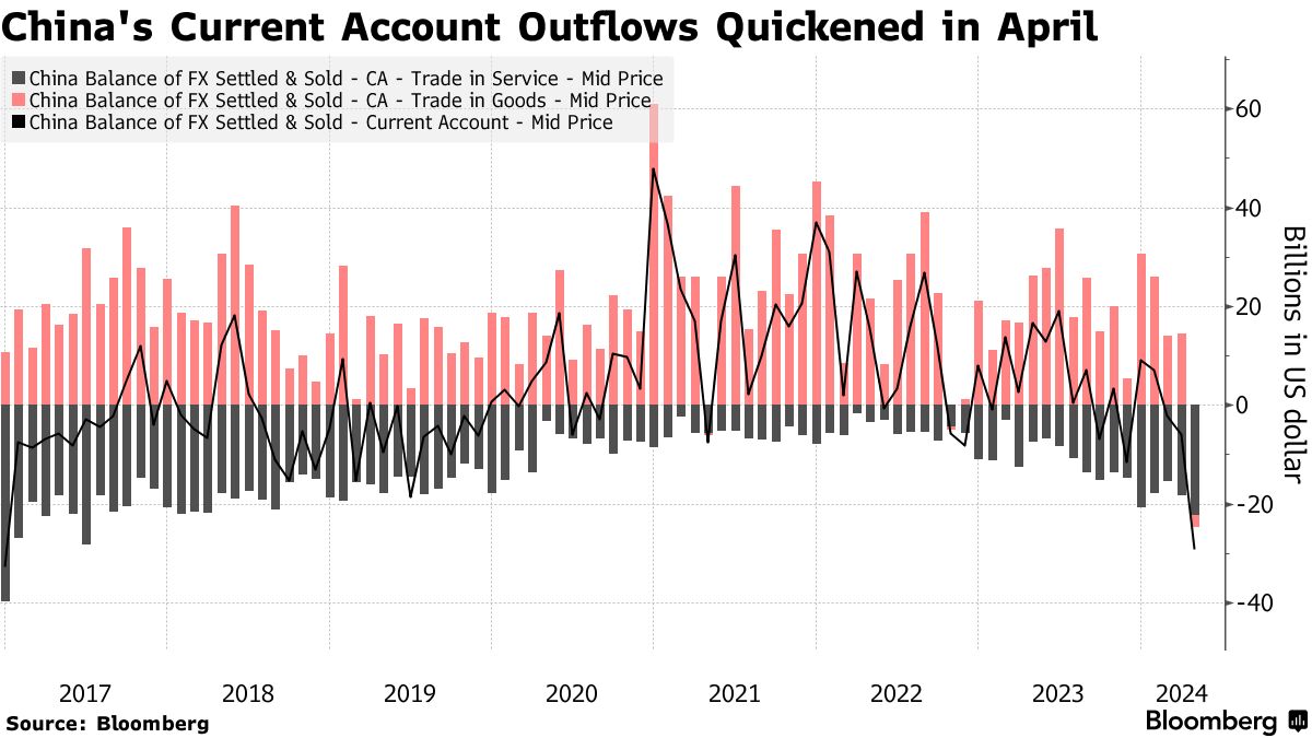 投资者在4月份更青睐资本项目下的外汇资产,这表明他们对非人民币计价的证券更为乐观。当前账户也未支持人民币,因为显示出净购买外币,这在中国长期以来享有出口顺差的情况下是罕见的。与出境旅游相关的服务赤字有所增加。