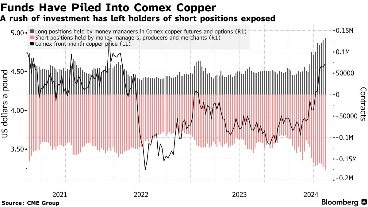 银行、矿商和投资基金数月来一直在宣扬铜的长期前景乐观,过去几周市场涌入大量投资,给持谨慎态度的空头交易员带来压力,他们认为由于中国等地的现货需求疲软,铜市前景堪忧。