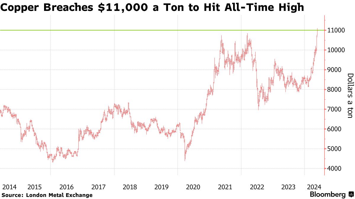 铜价创历史新高,突破11,000美元,因市场担心供应短缺 - 彭博社