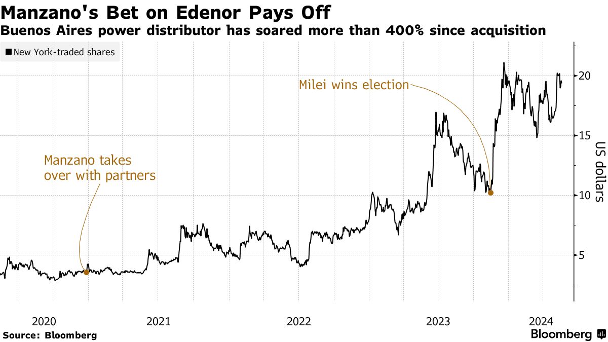 在Milei的领导下,已经表现良好的交易之一是Manzano与合作伙伴在三年多前购买了布宜诺斯艾利斯电力分销商Edenor SA的控股权。自收购宣布以来,纽约上市的Edenor股价已经上涨了超过400%。