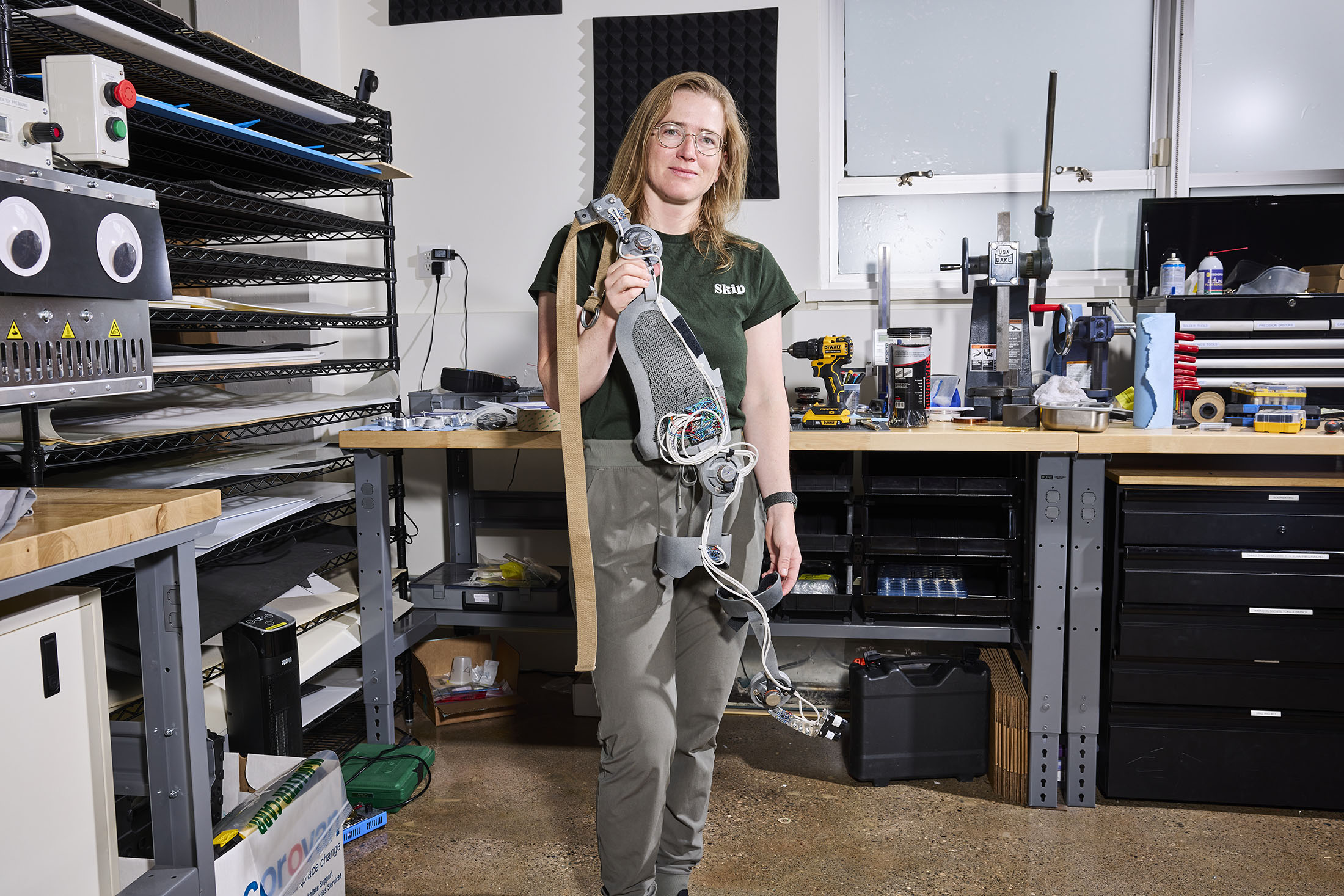 新西兰赞赏独立带来的好处,比如能够邀请一名记者到她在旧金山的办公室进行演示。这款设备被设想为治疗膝盖疼痛,我试用的设备形状像一只大腿高筒靴,内置传感器和电机,用于研究我的步态并在恰到好处的时刻提供支撑。在我迈出第一步之前,我就能感觉到电机在预期中抽搐。当我开始行走时,它们开始运转,减少了我肌肉需要施加的力量;当我上楼梯时,它们的嗡鸣声逐渐变成了低沉的轰鸣声。