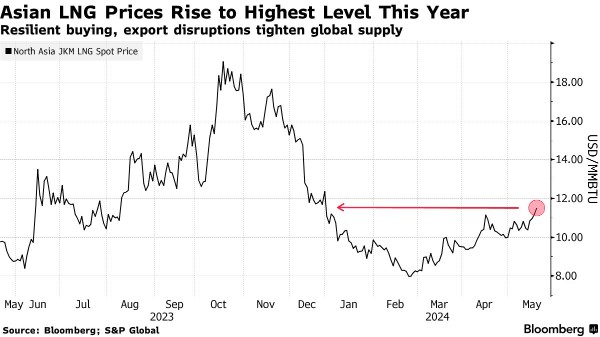 亚洲进口商如日本和韩国在北半球夏季来临之前重新填补天然气库存,加剧了由马来西亚和澳大利亚设施中断引起的供应紧张情况。