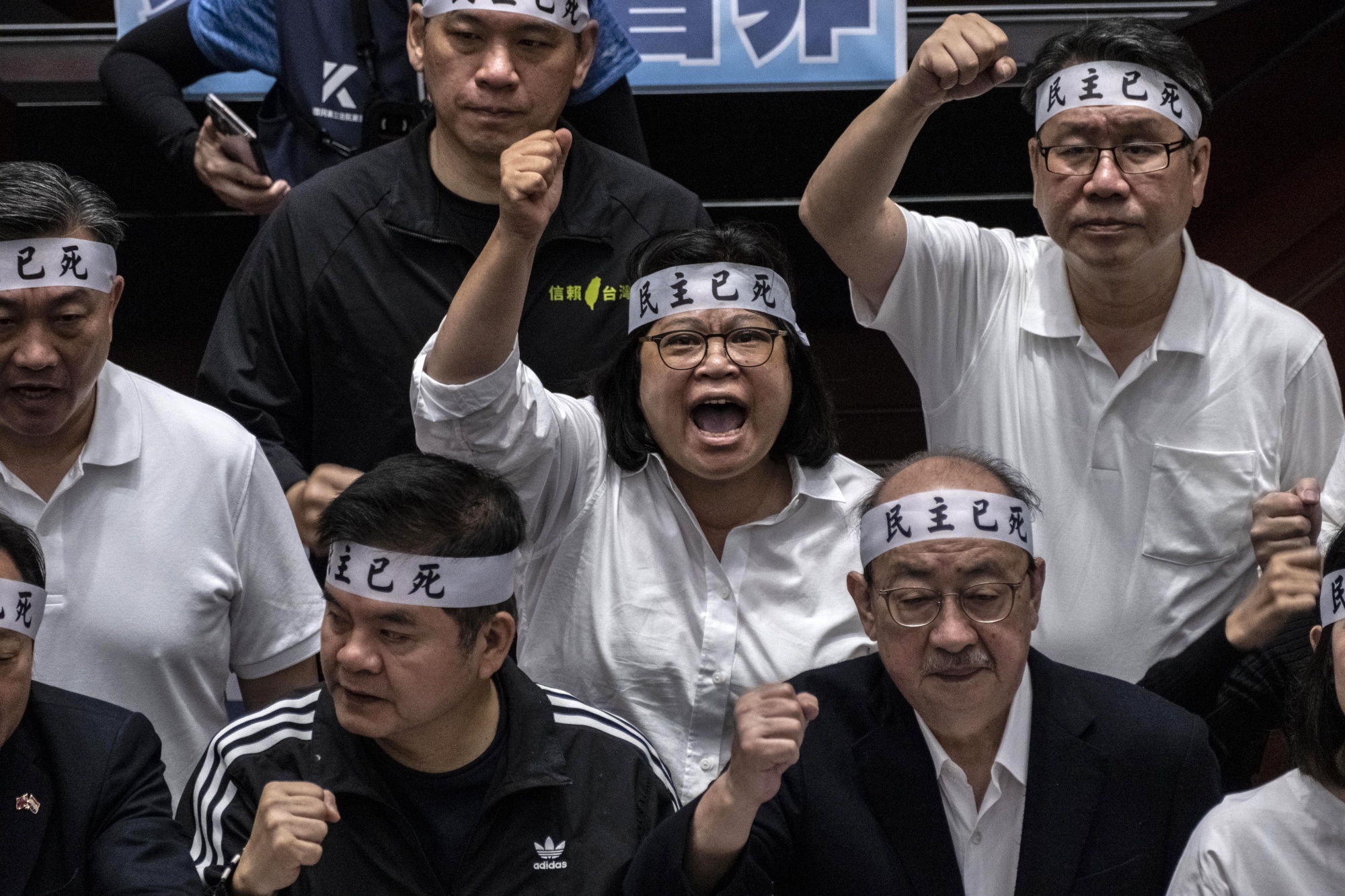 国民党议员围绕立法院院长韩国瑜中心集结,民进党议员在台北抗议,日期为5月21日。摄影师:Lam Yik Fei/BloombergLai 赢得 今年早些时候总统竞选中仅获得40%的选票,而国民党赢得了立法机构中的大部分席位,并控制了议长职位。