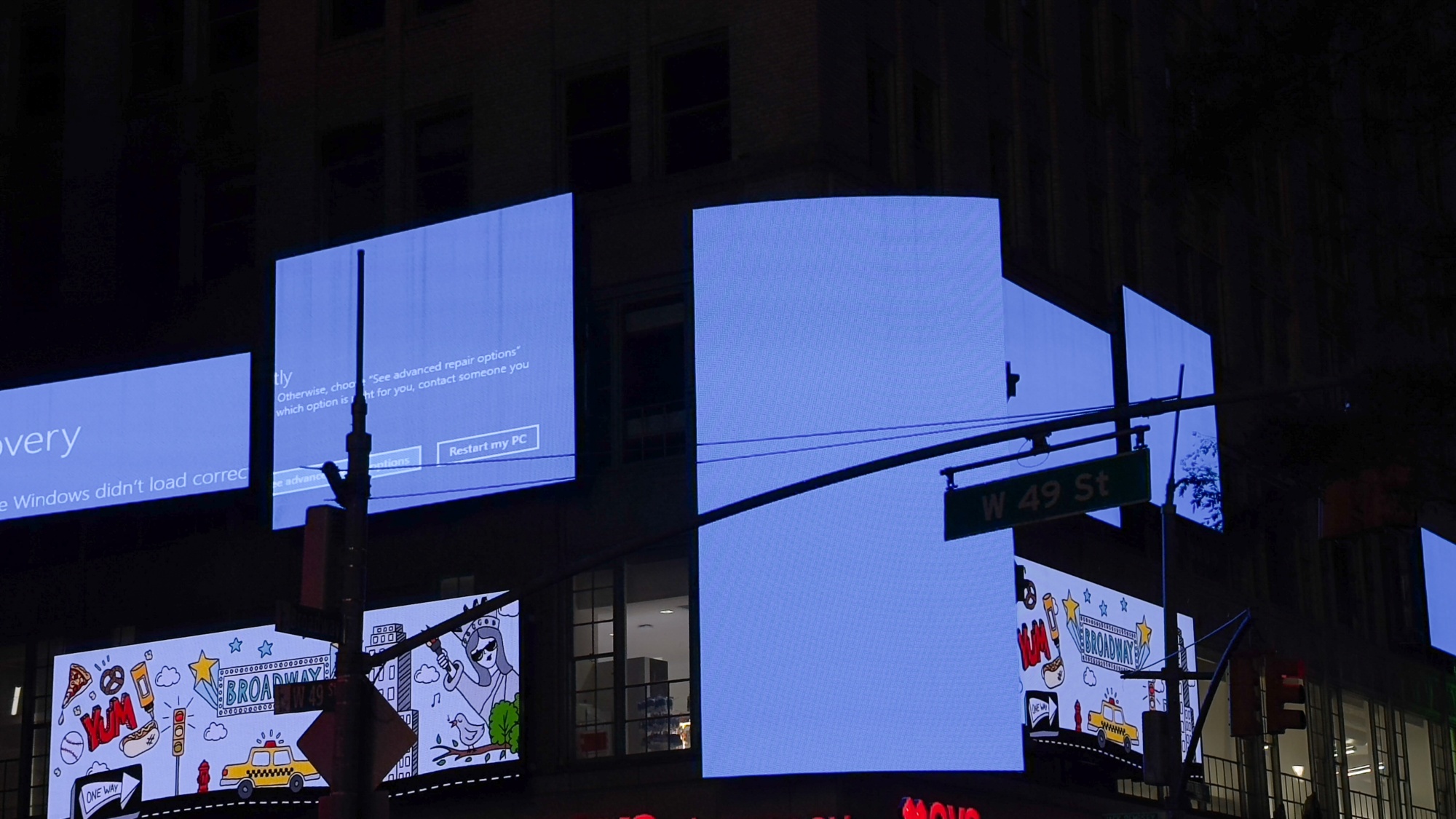 由于CrowdStrike在7月19日在纽约造成的全球通信中断,时代广场的数字广告牌出现空白。